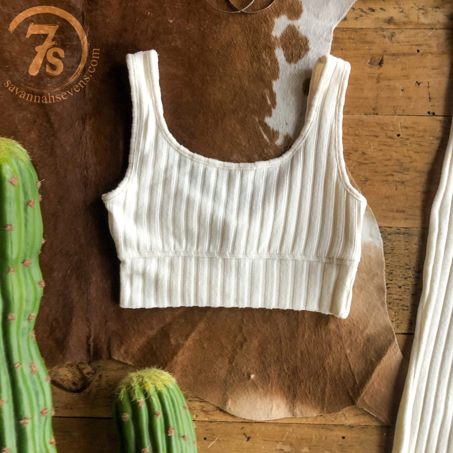 - Ivory ribbed knit bralette.