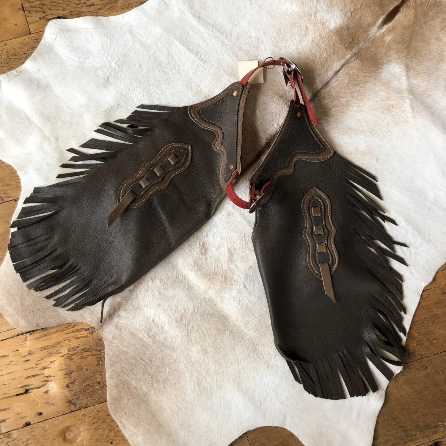 - Handmade leather cowkid chinks.