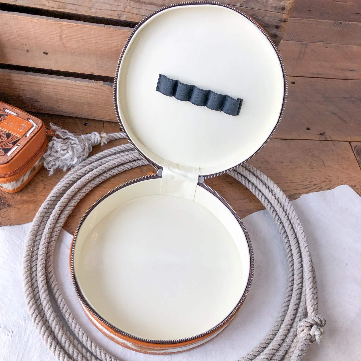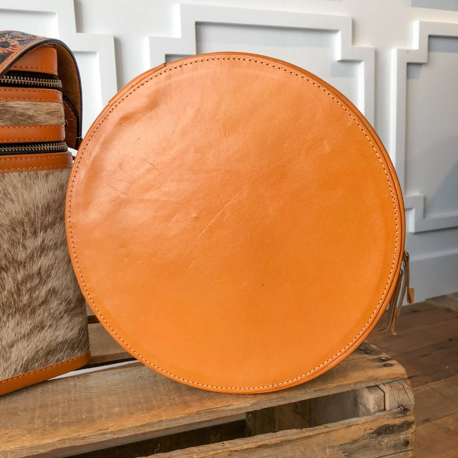- Handmade hair on hide tooled leather round makeup case.
