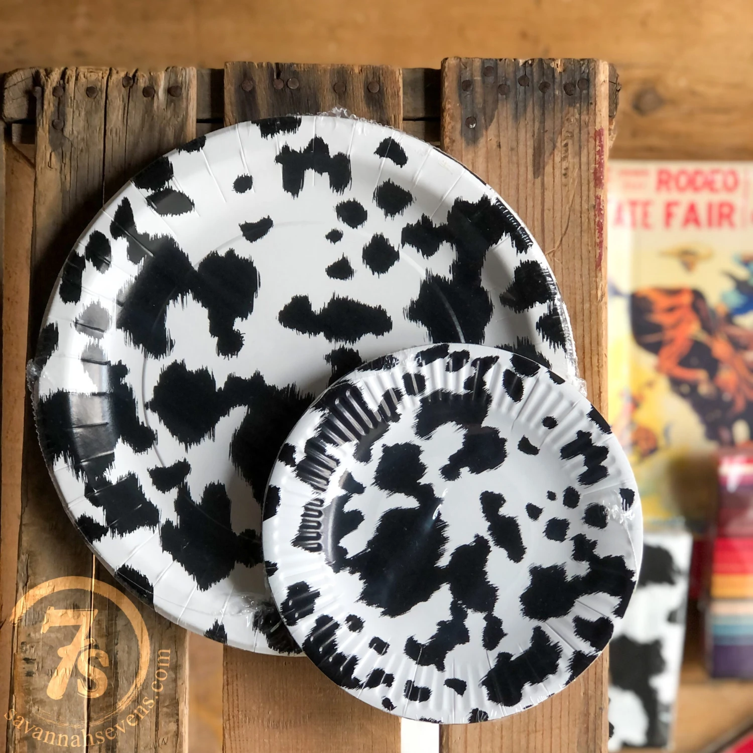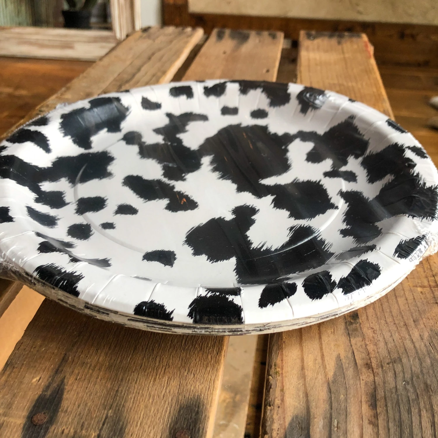- Black and white cowhide print round dessert and dinner plates.