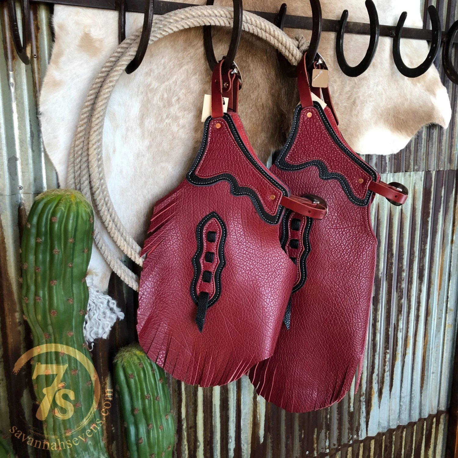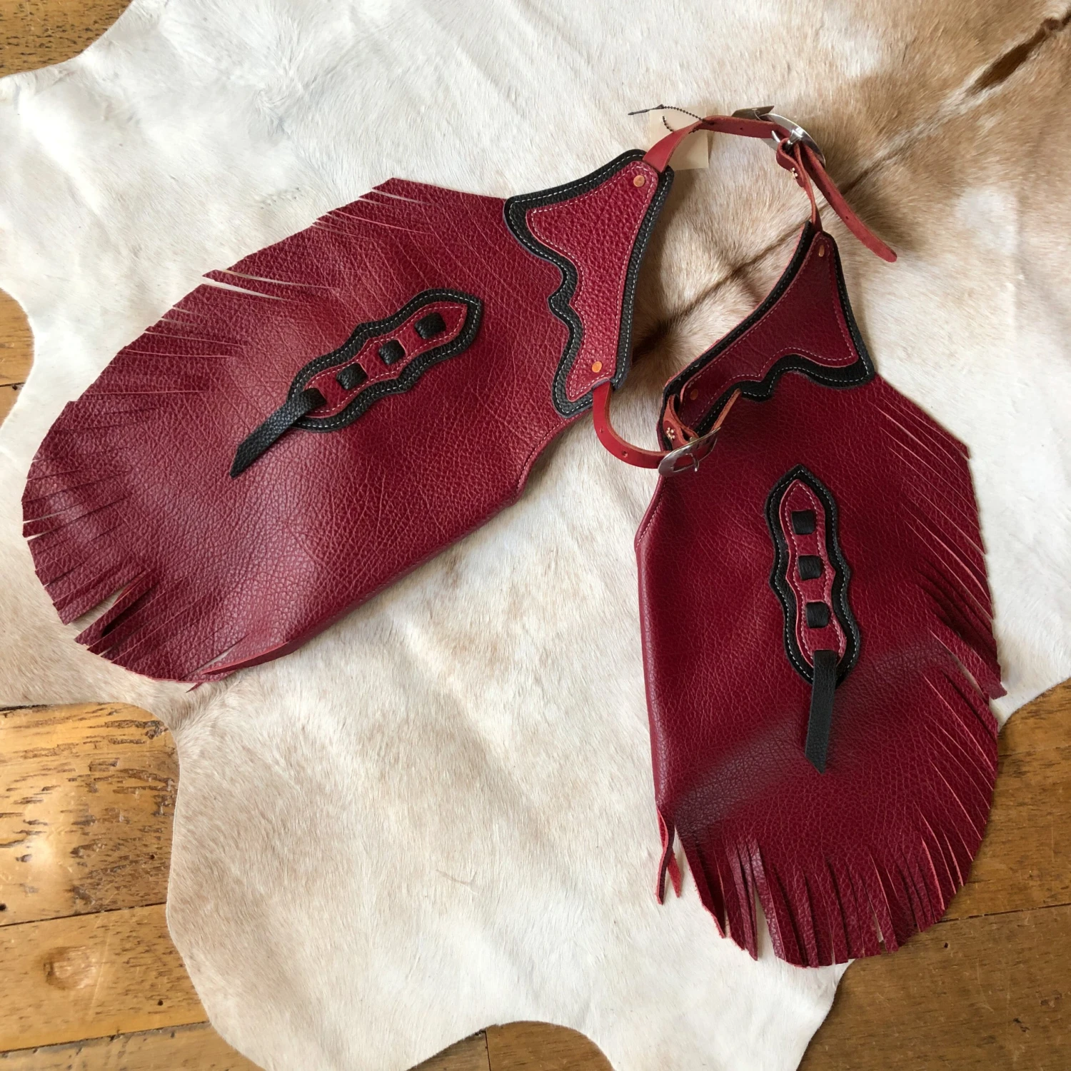 - Handmade leather cowkid chinks.