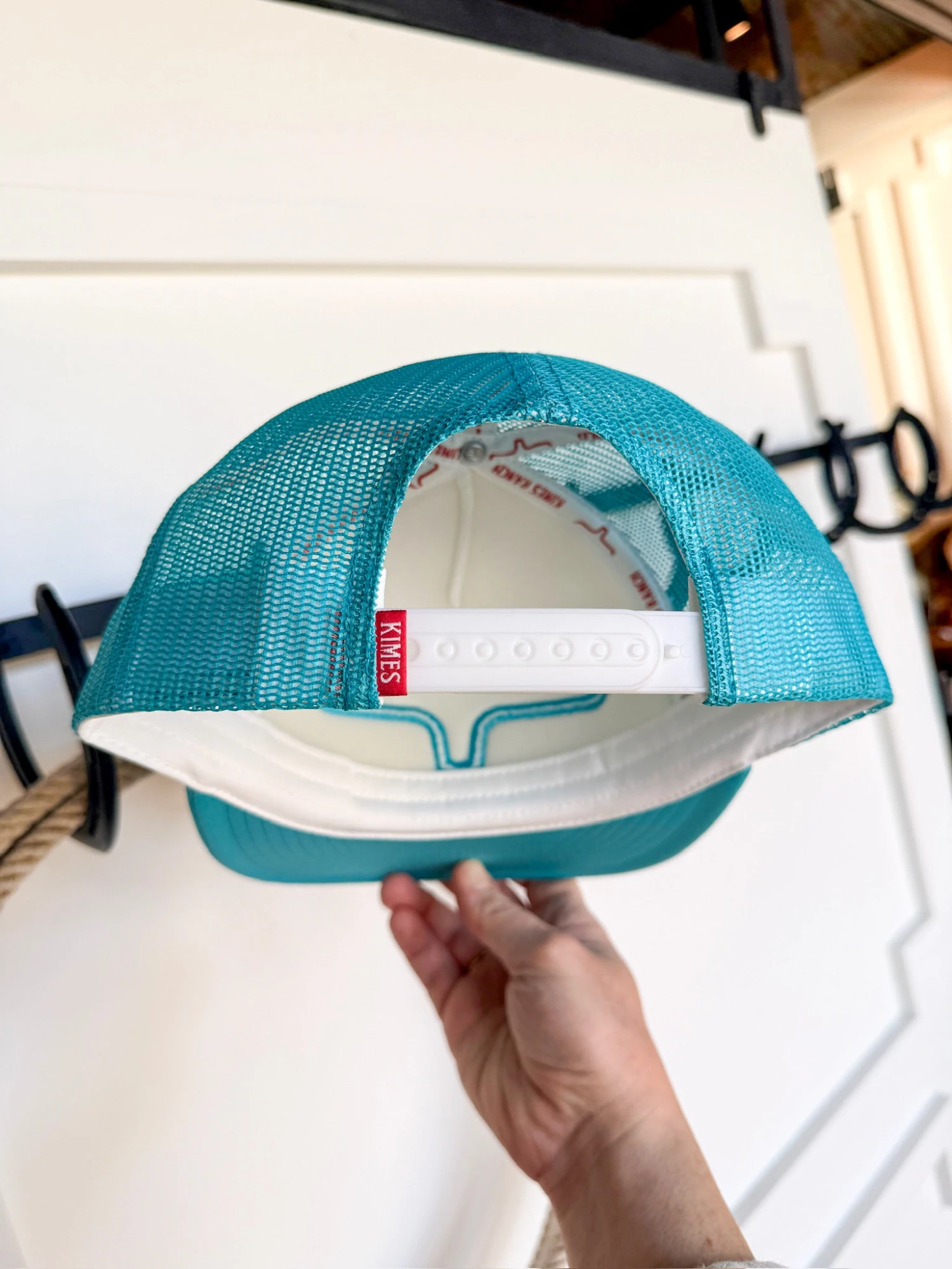 - Turquoise Kimes horns embroidery, bill, and mesh back.