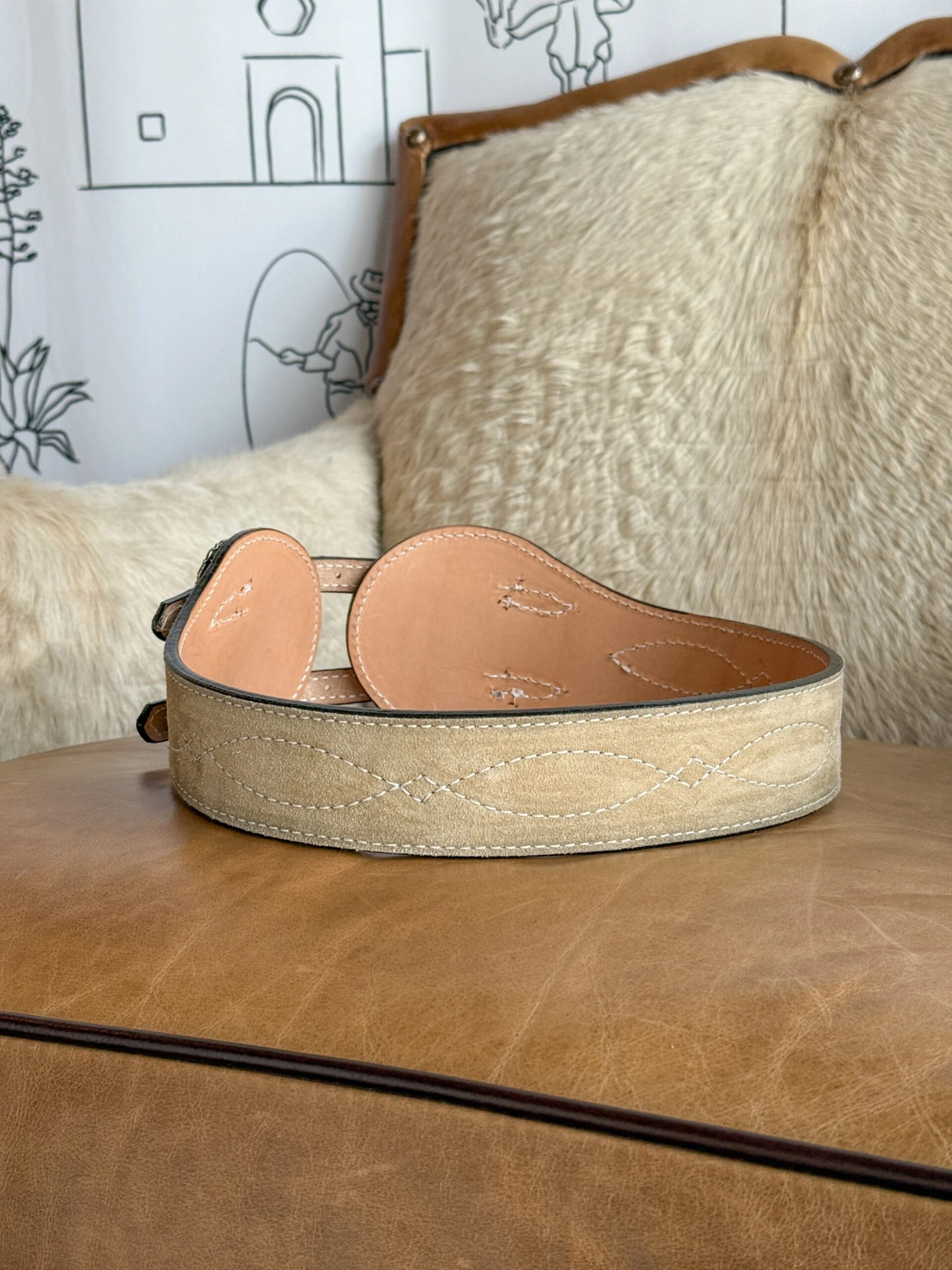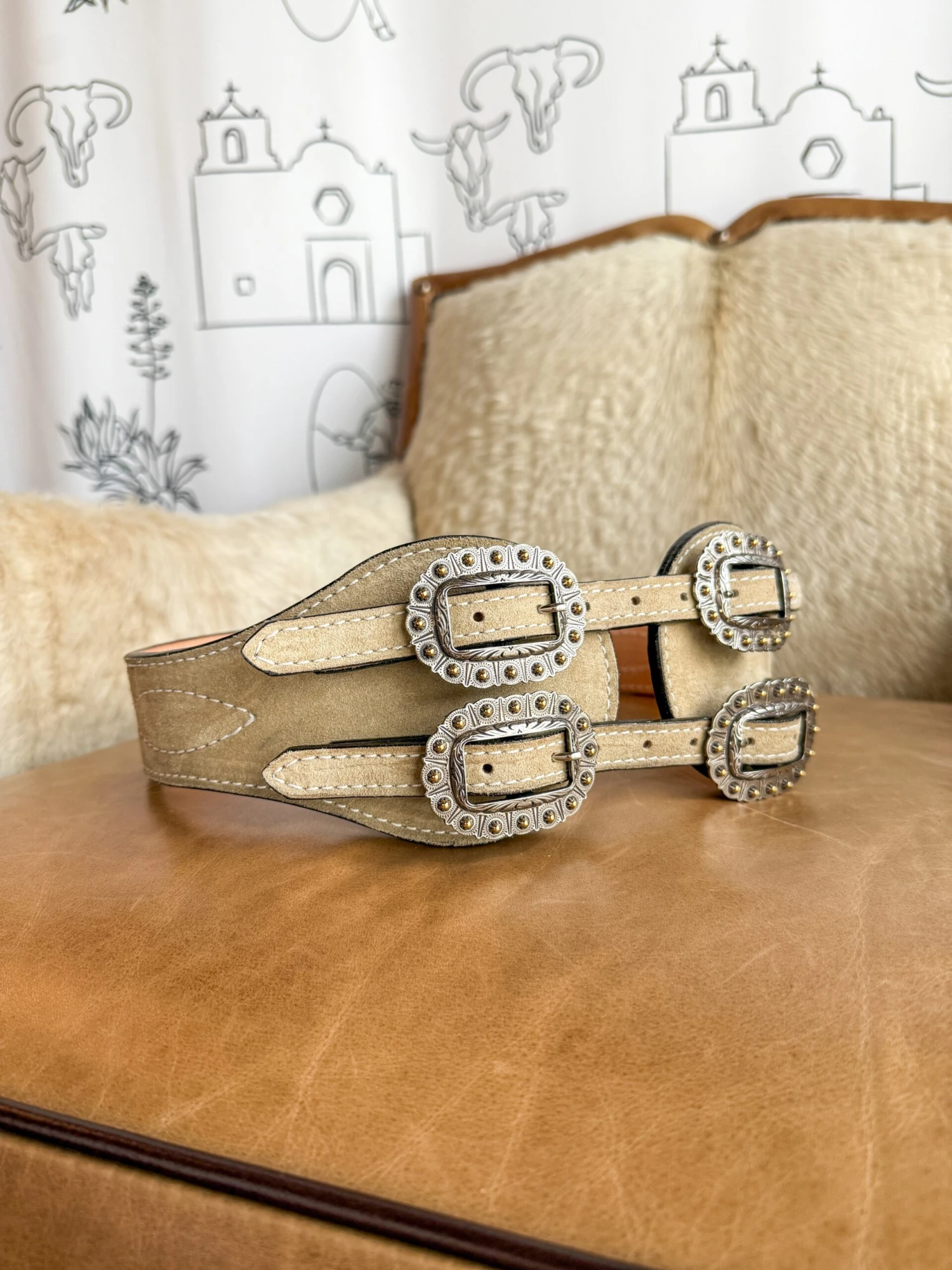 - Silver hand engraved buckles with parachute stud and scalloped edge details.