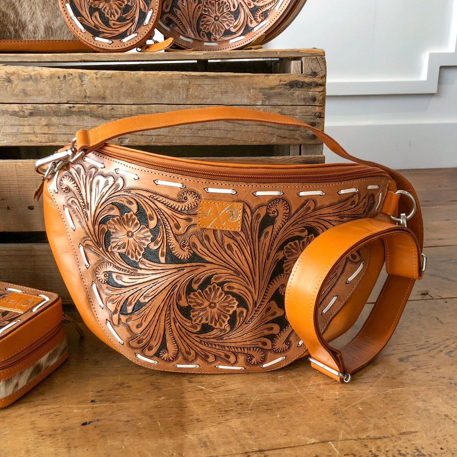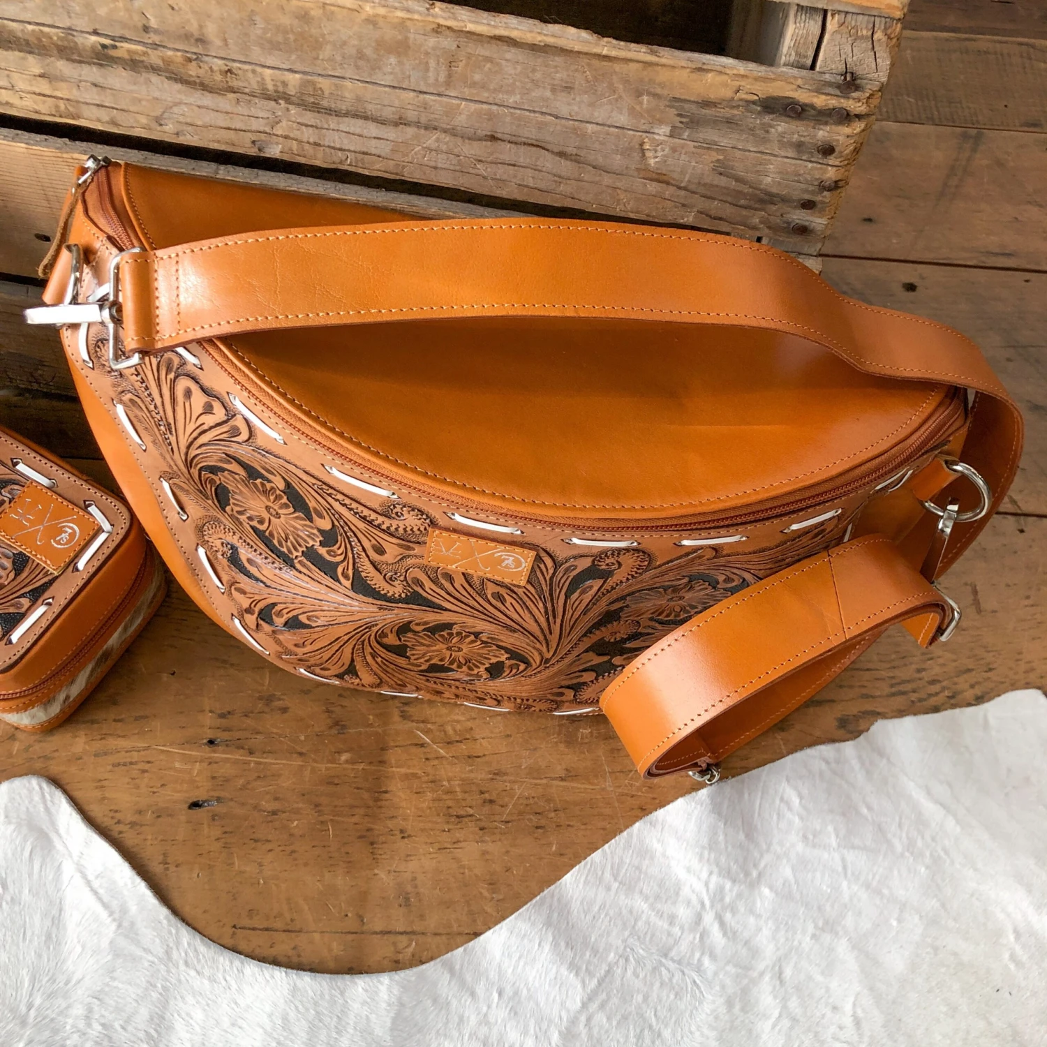 - Hand tooled leather front with white buck stitch detail and an embossed metallic leather collaboration patch.