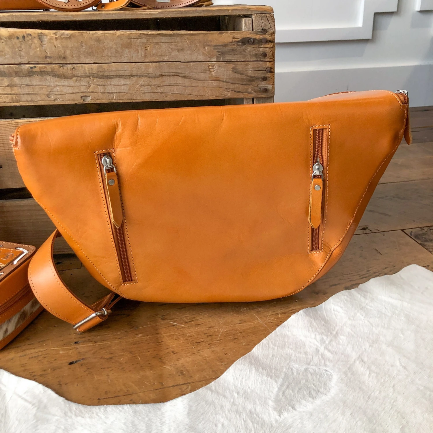 - Rich leather adjustable removable strap, top, and back.