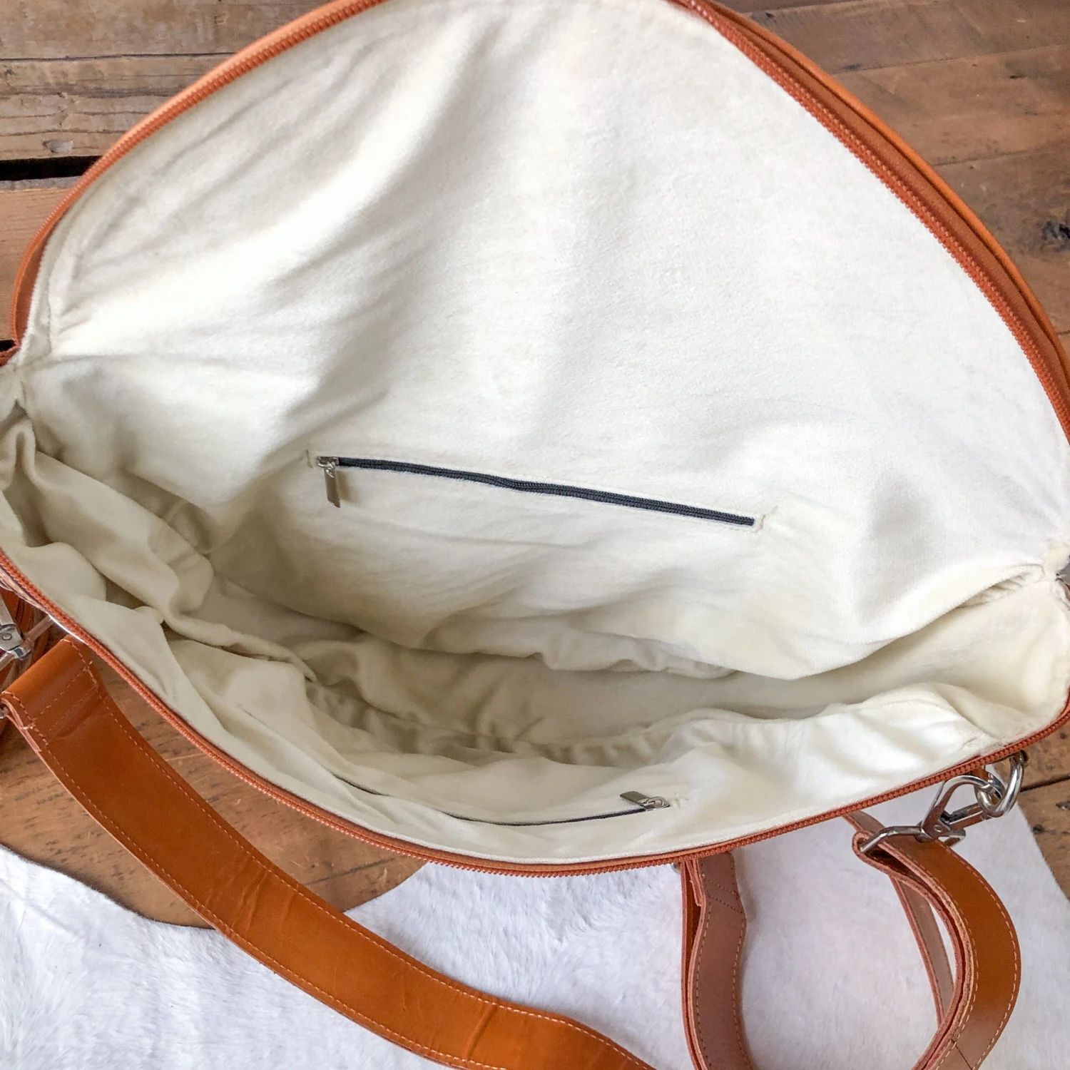 - Zipper closure with leather zipper pull.