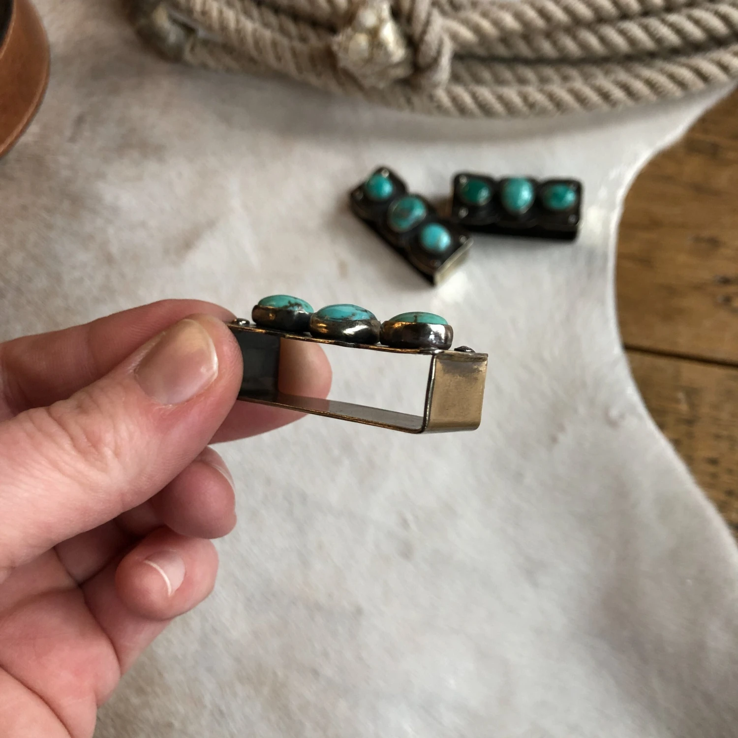 - Turquoise and German silver belt keeper.