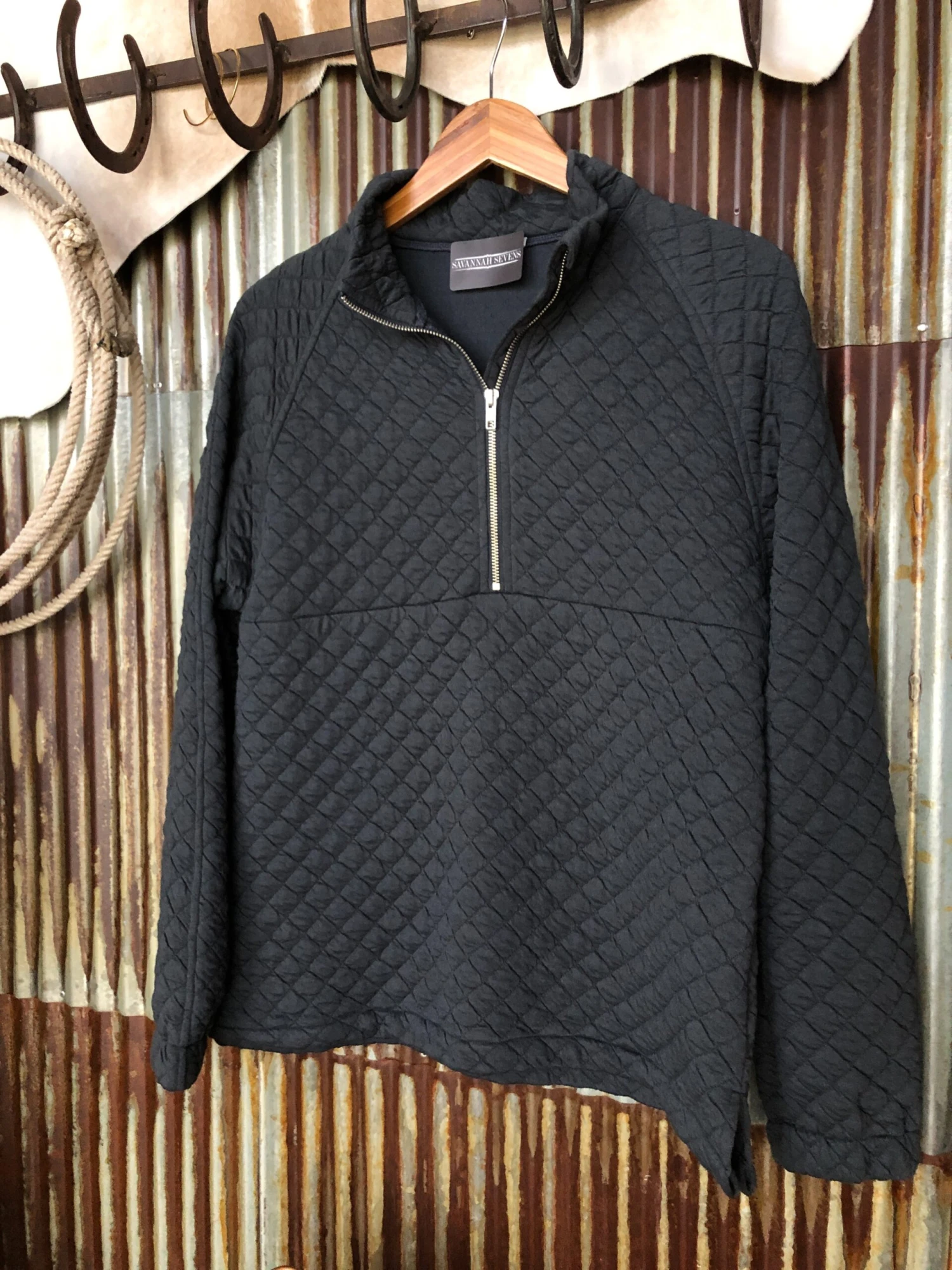 - Charcoal quilted long sleeve quarter zip pullover.