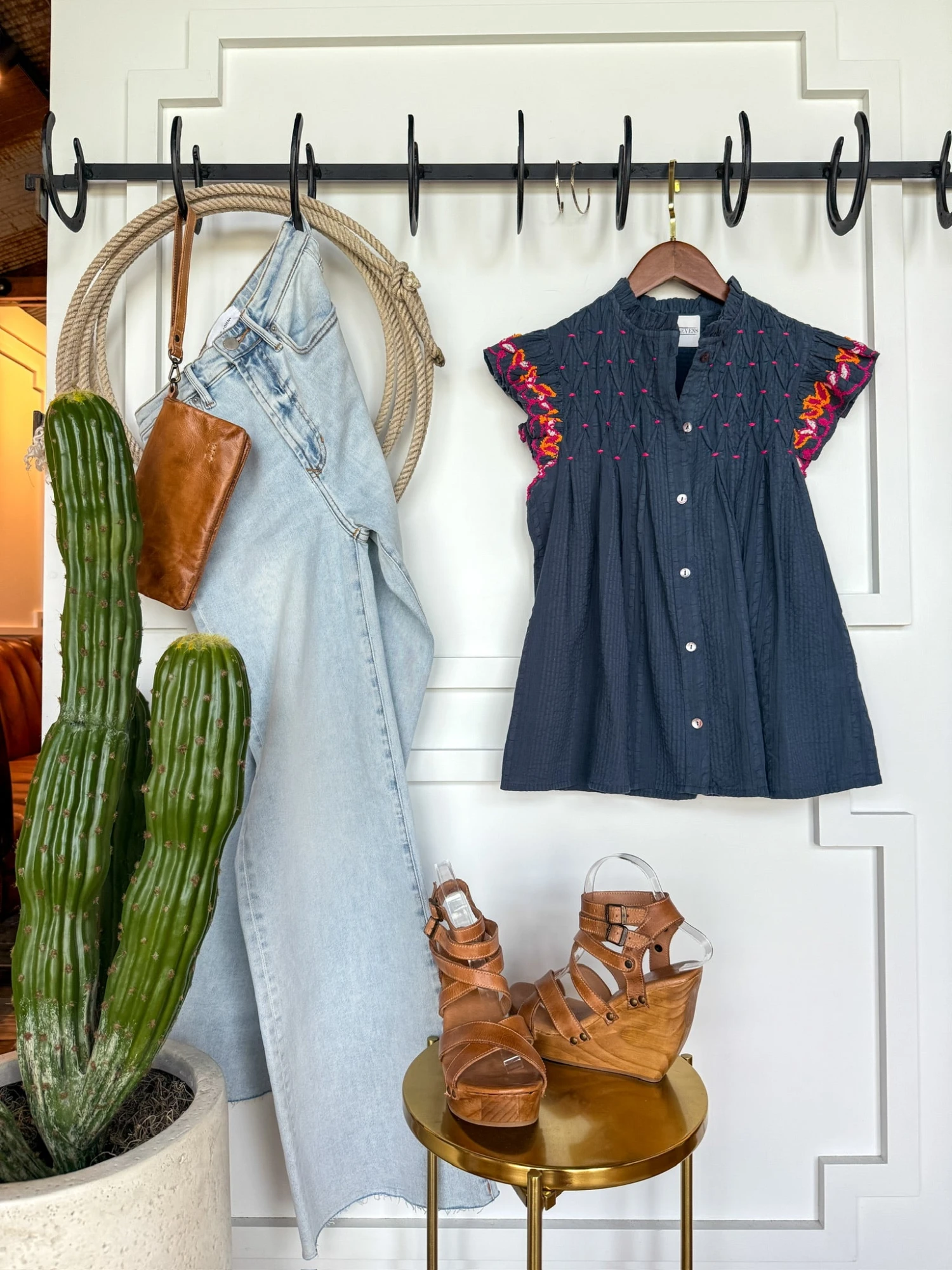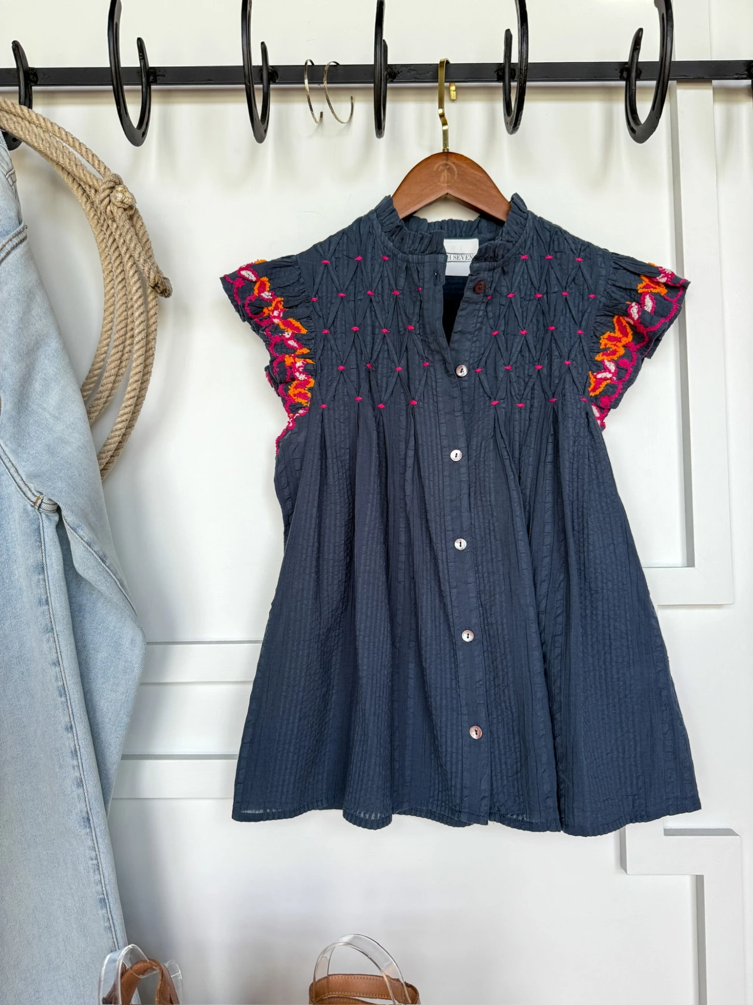 - Dusty midnight blue embroidered short sleeve summary up top.