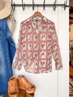 - White with Hawaiian inspired earth tone and aqua surfer bum cowboy, surfin’ longhorns, horses, & sharks throughout.
