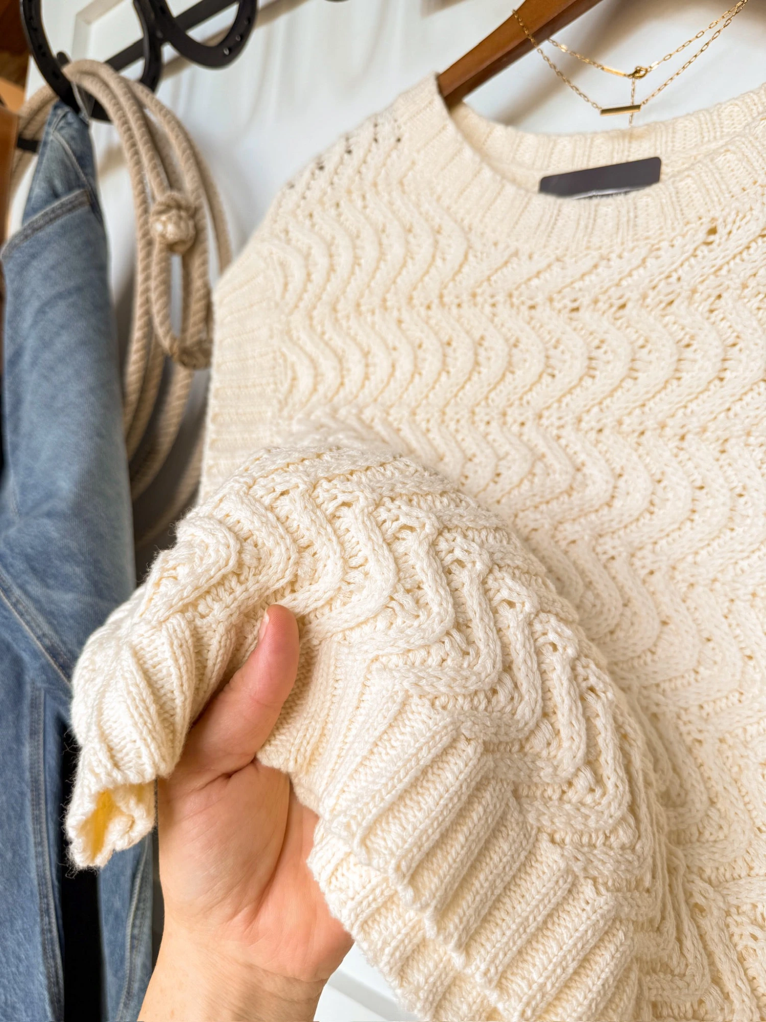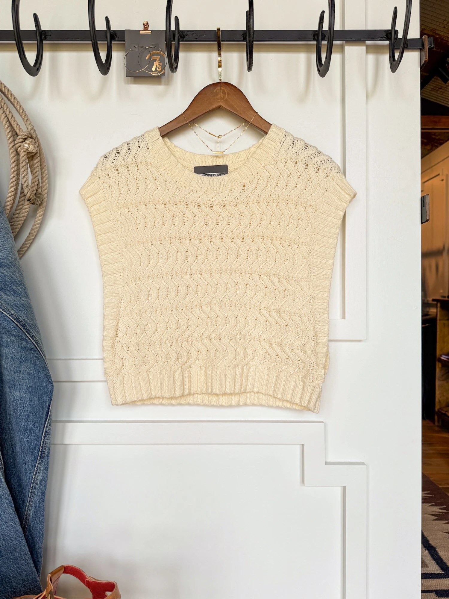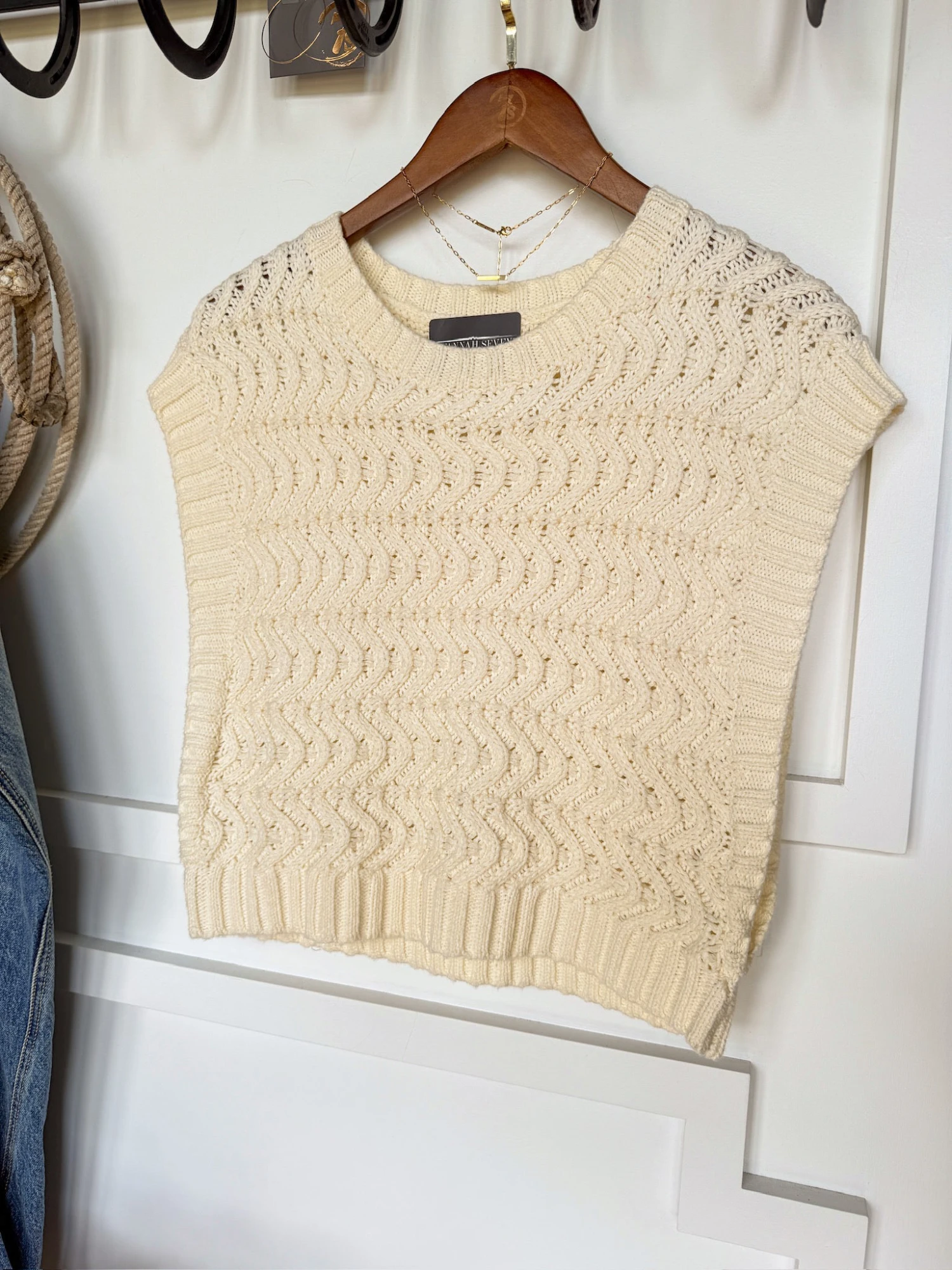 - Cream knit sleeveless top.