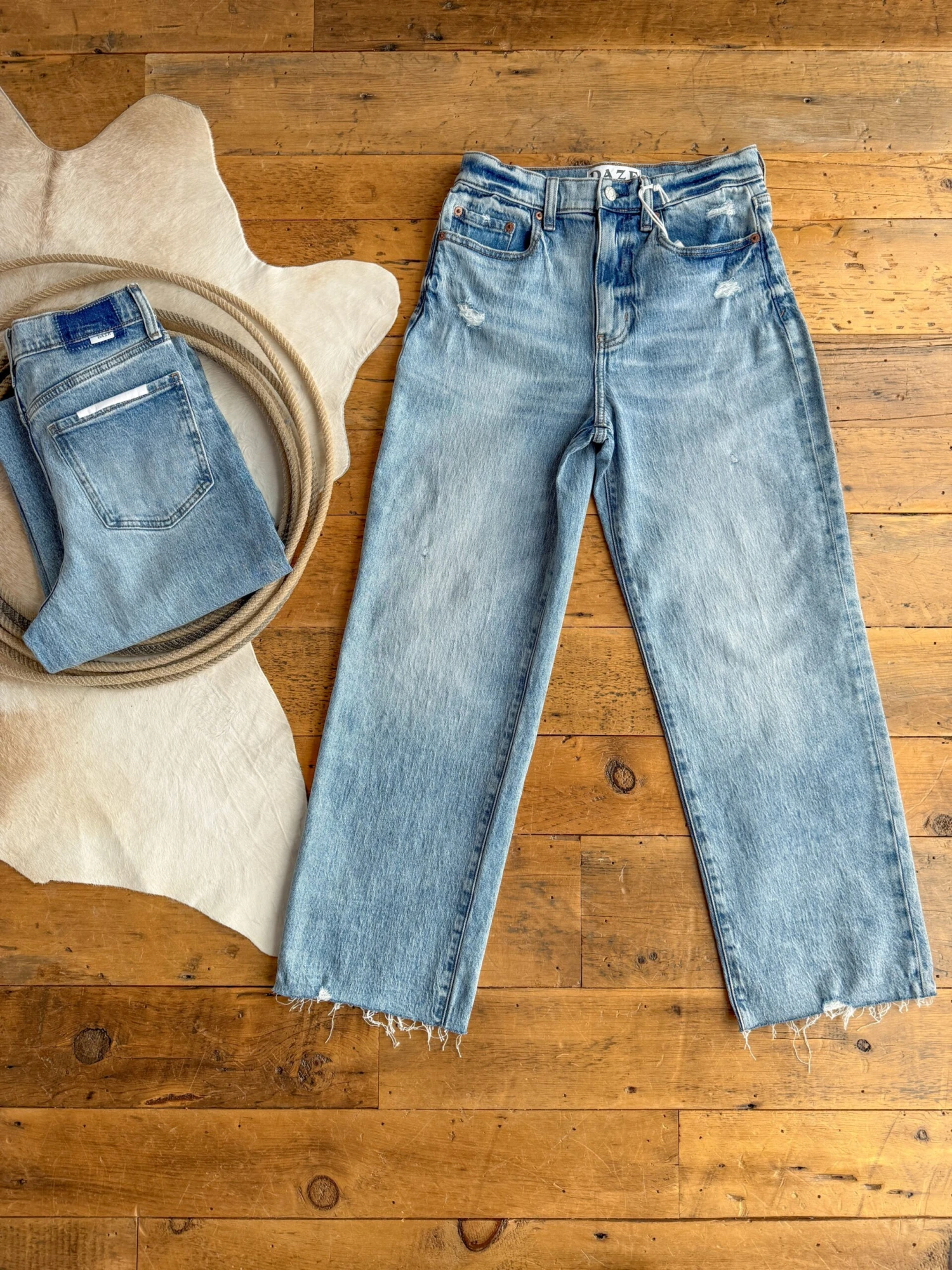 - Medium vintage wash distressed 90’s wide leg jean.
