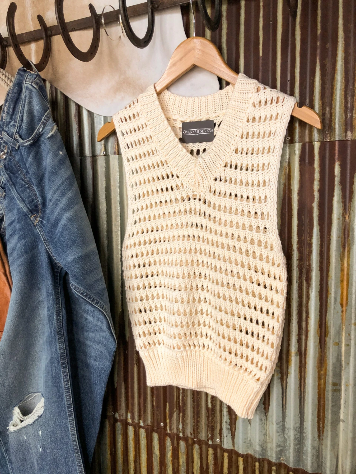 - Cream open knit sleeveless top.