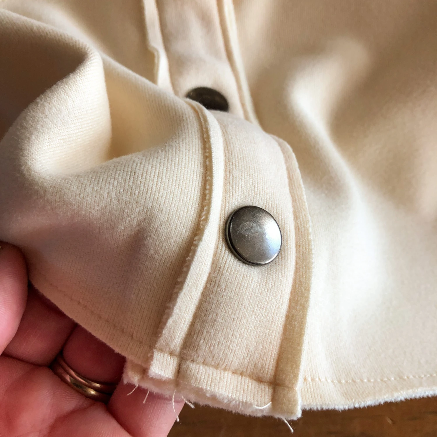 - Raw cut hem and collar.