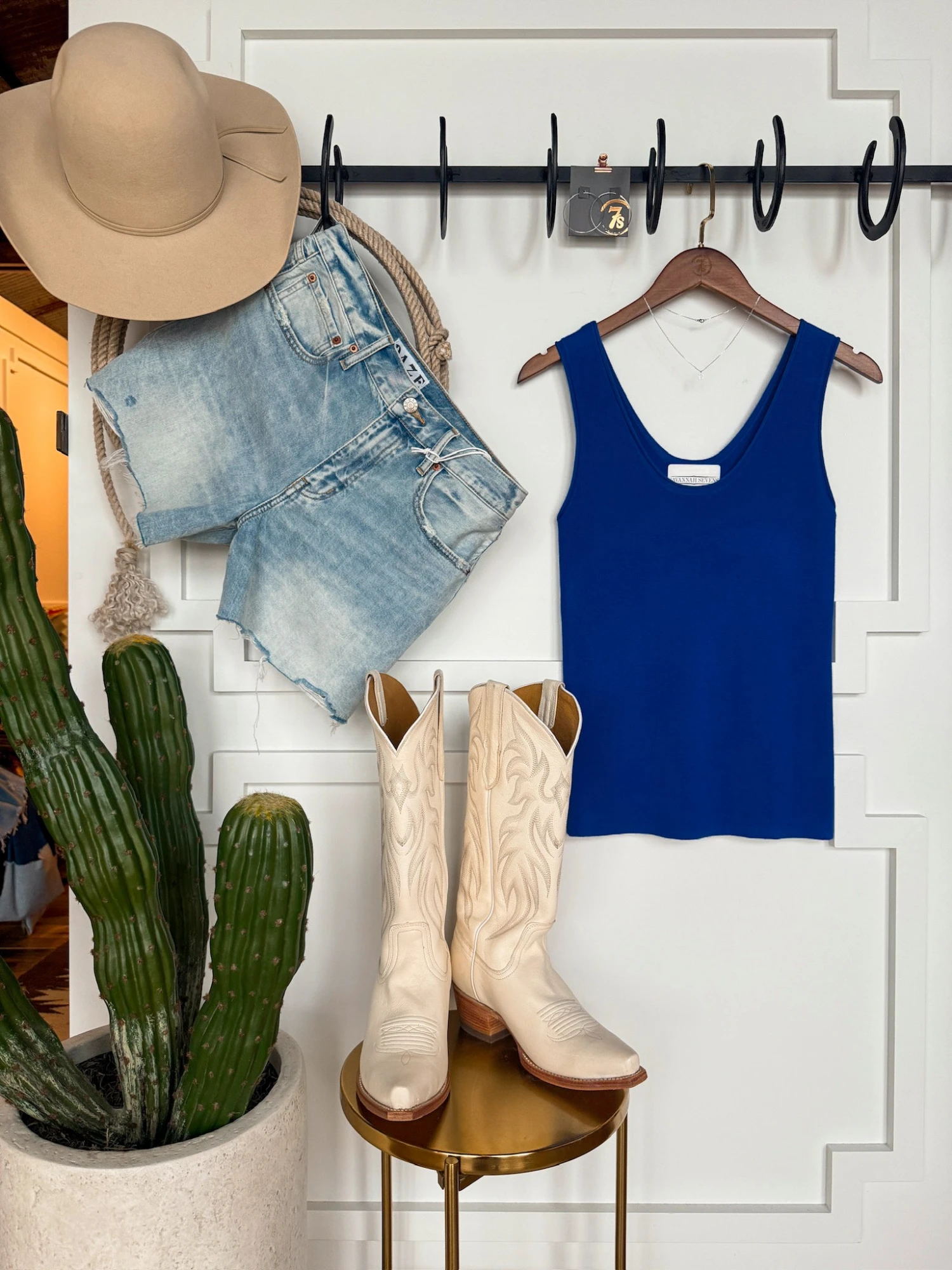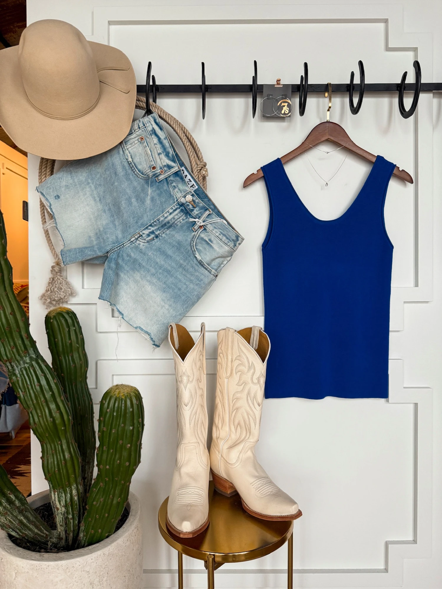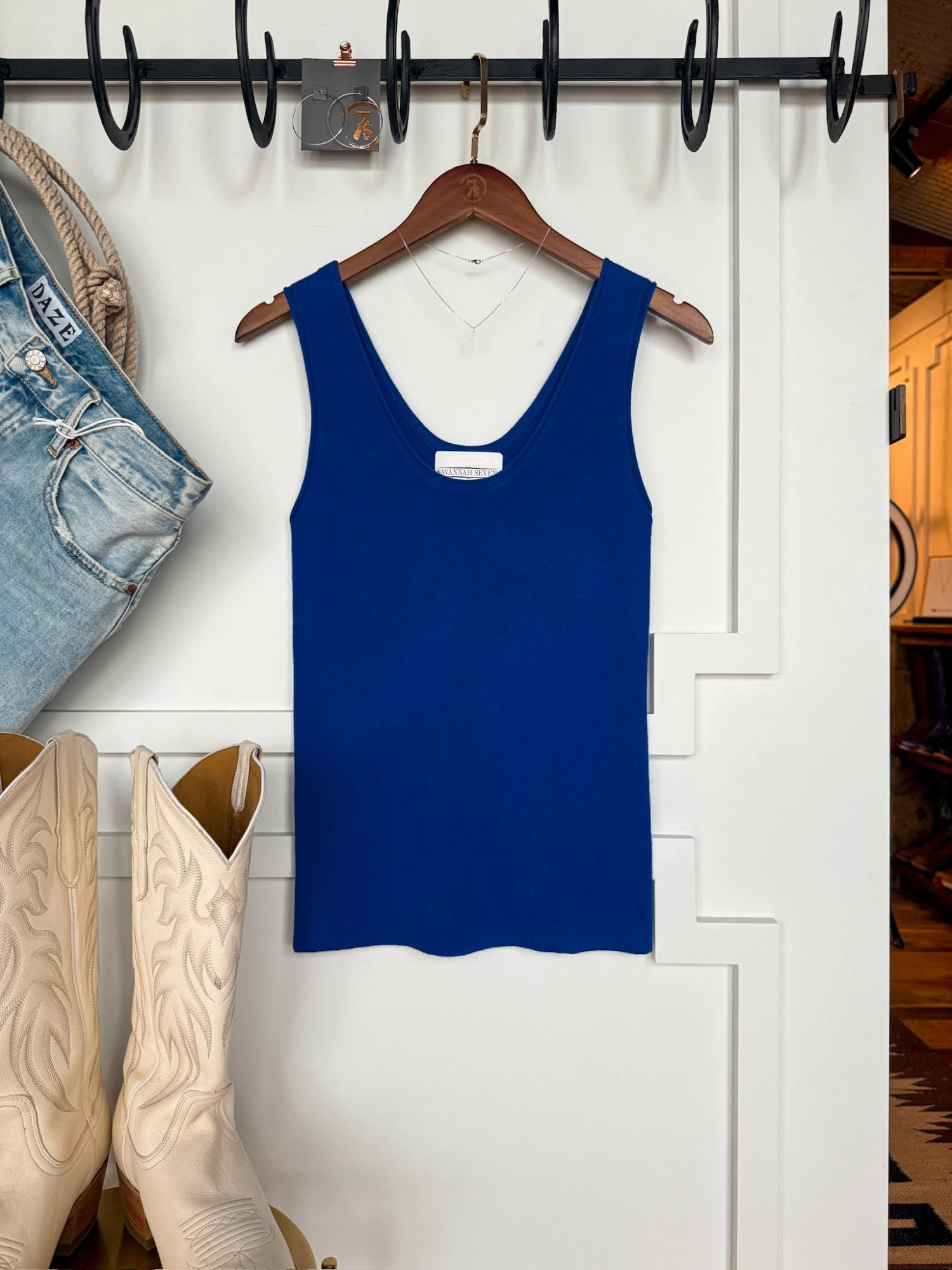 - Royal blue sleeveless top.