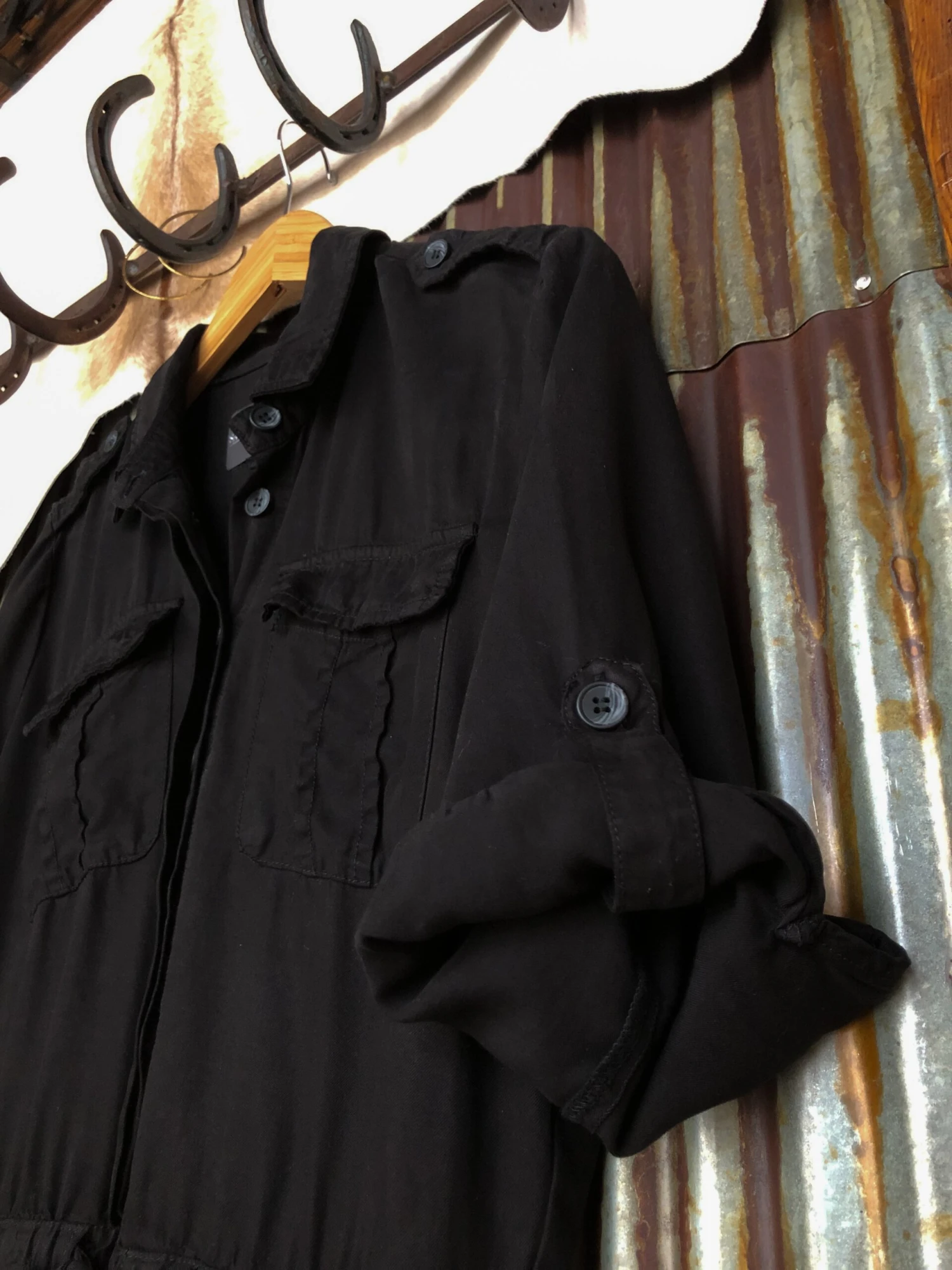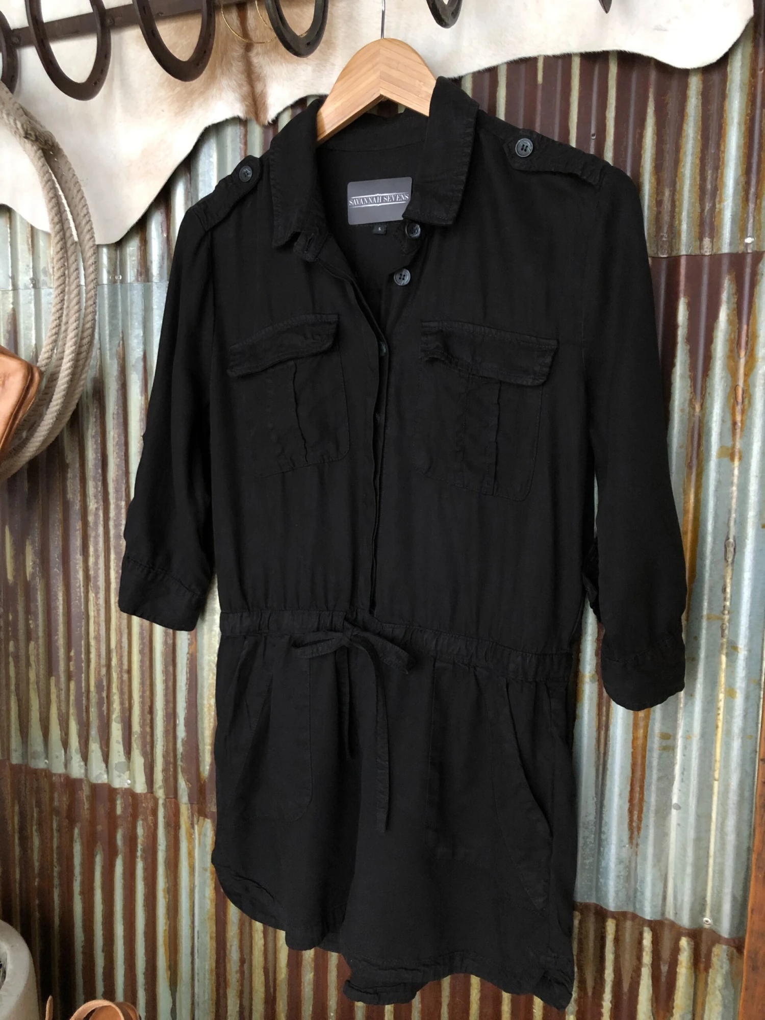 - Black 3/4 length sleeve tencel romper.