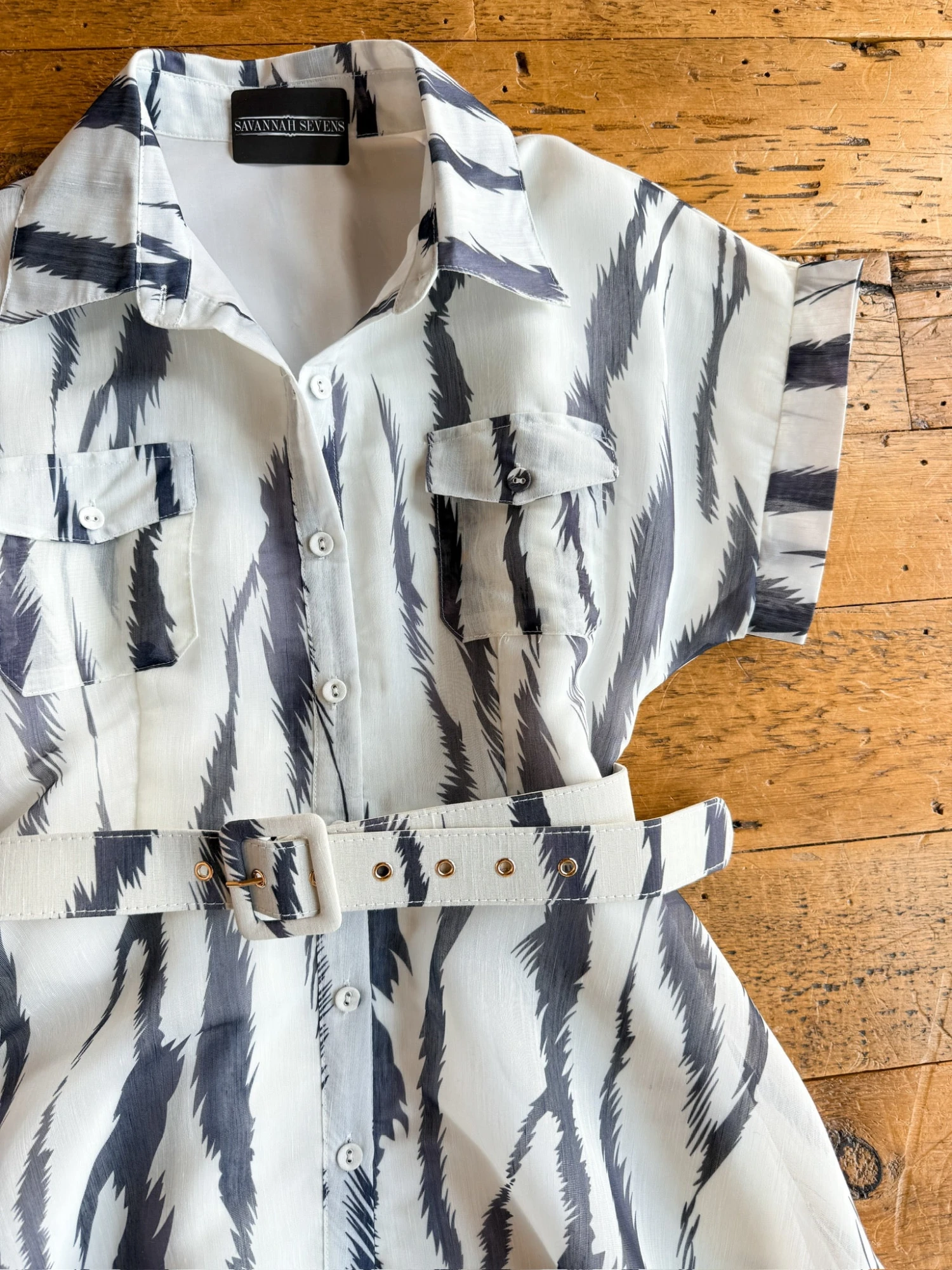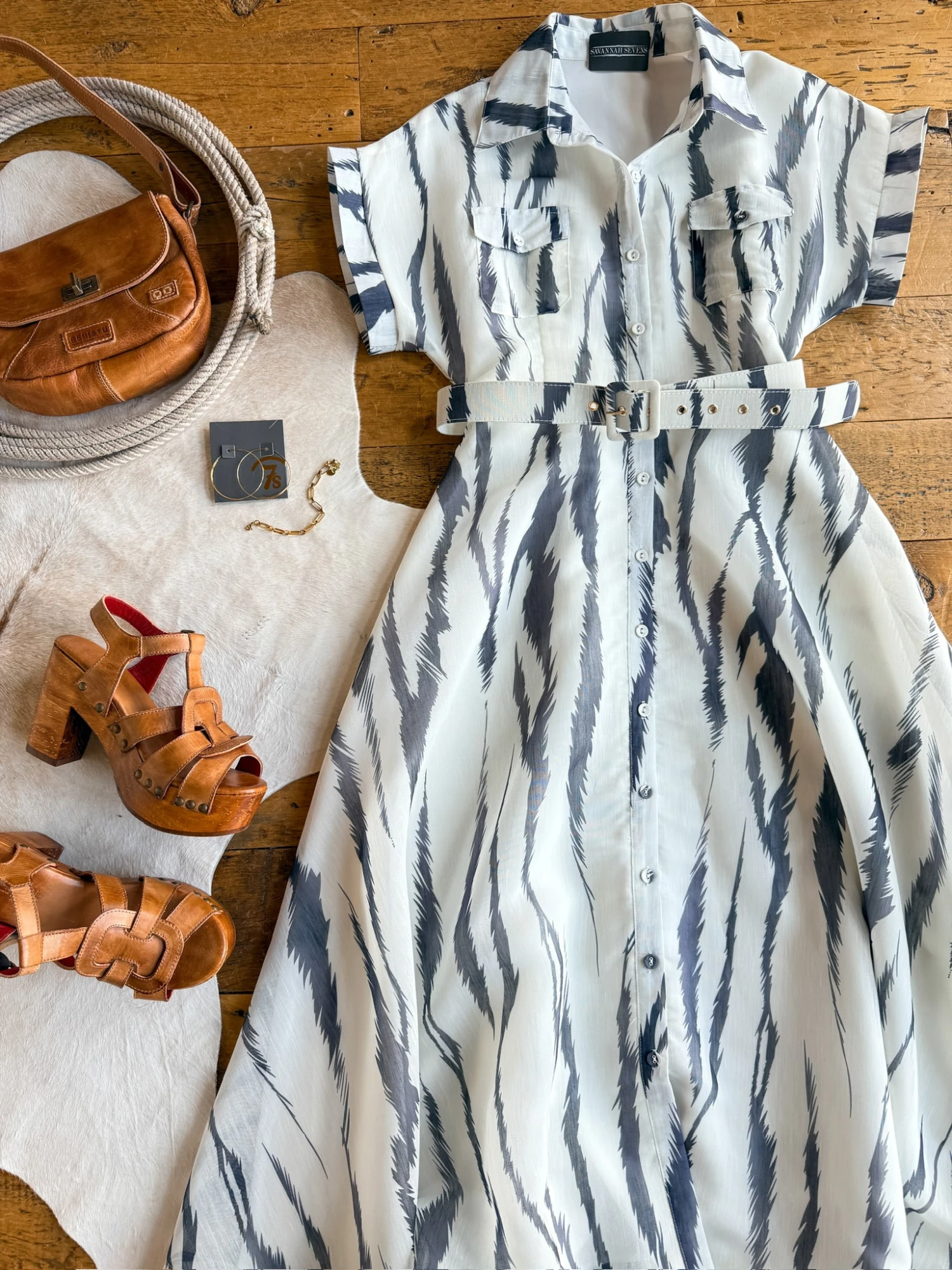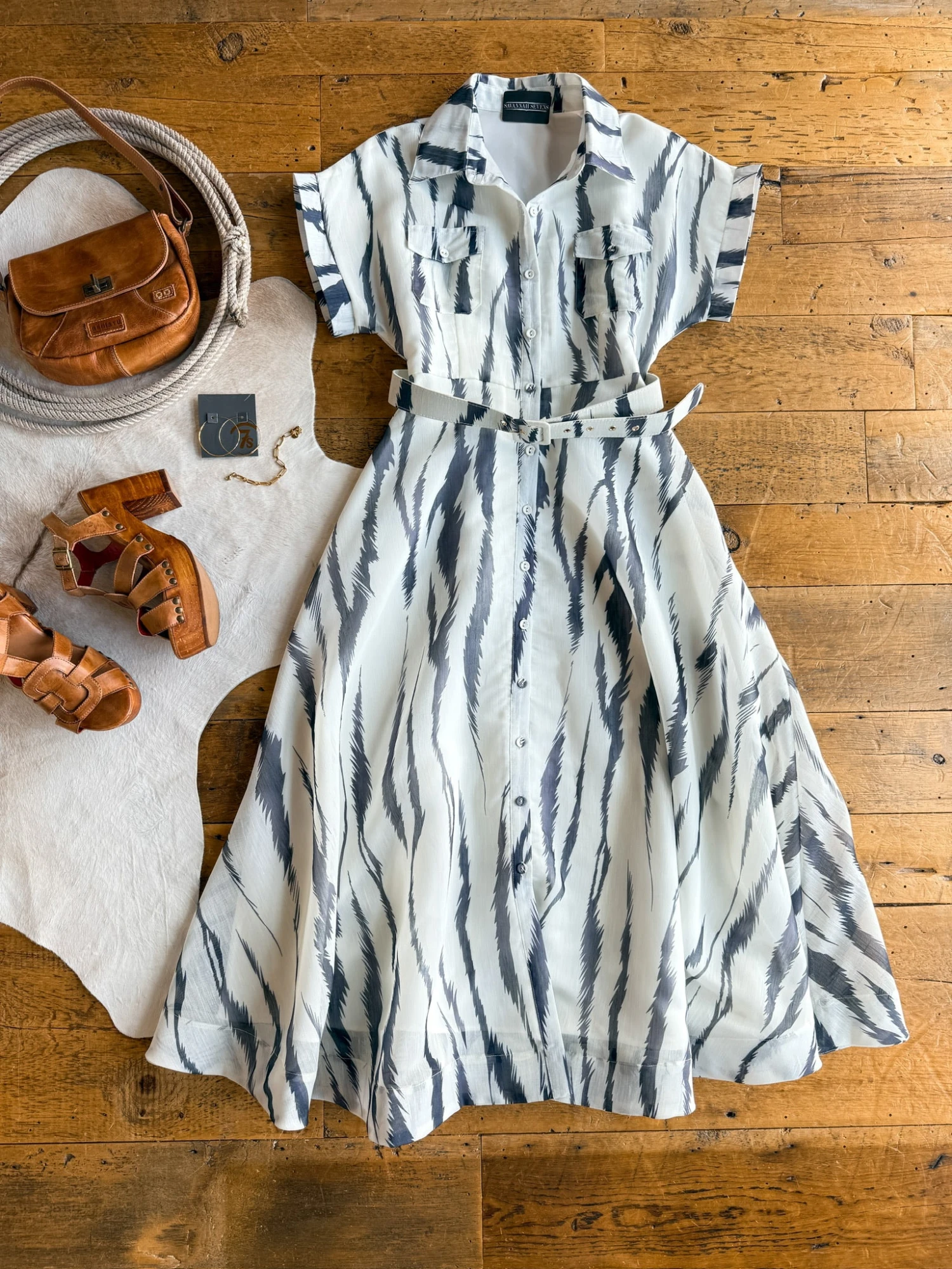 - Matching adjustable belt with brass hardware.