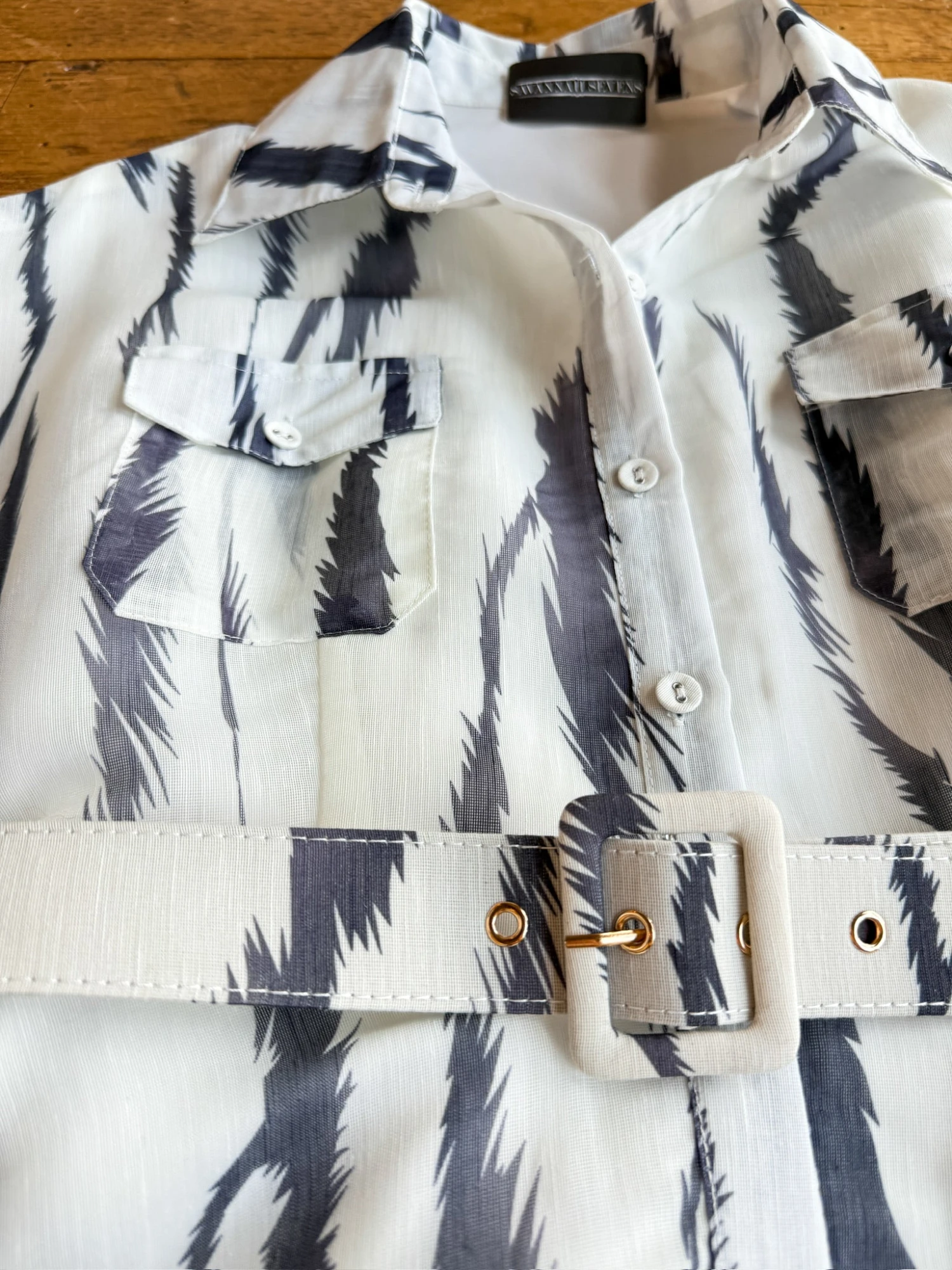 - White sheer overlay with charcoal exotic print and a soft fabric lining.