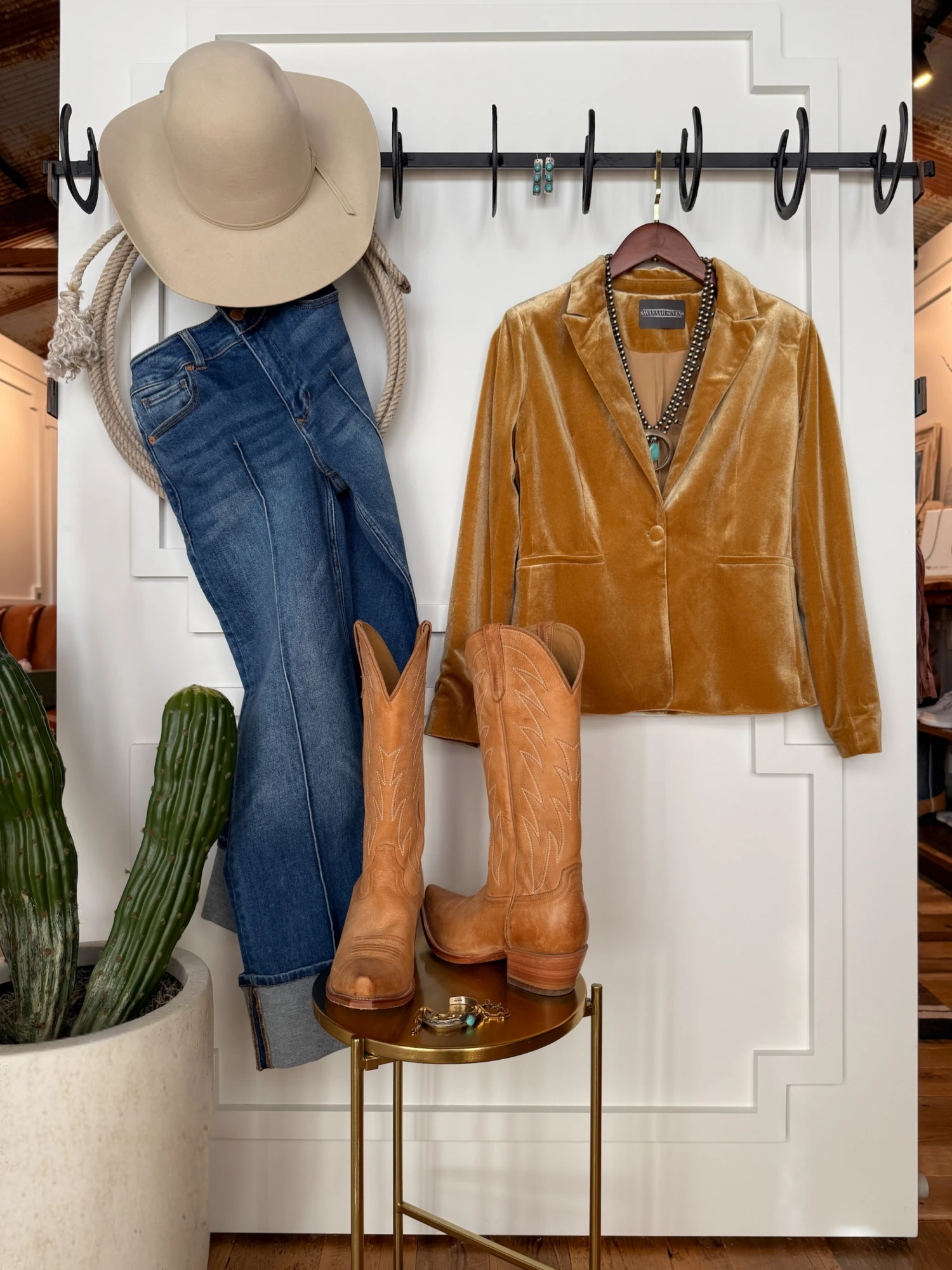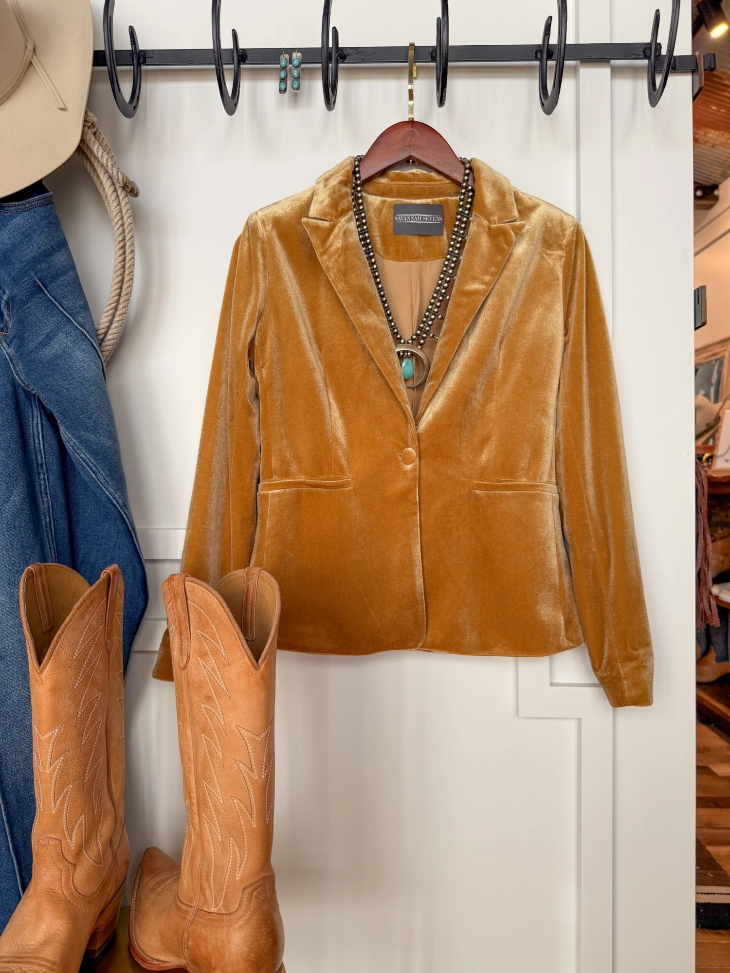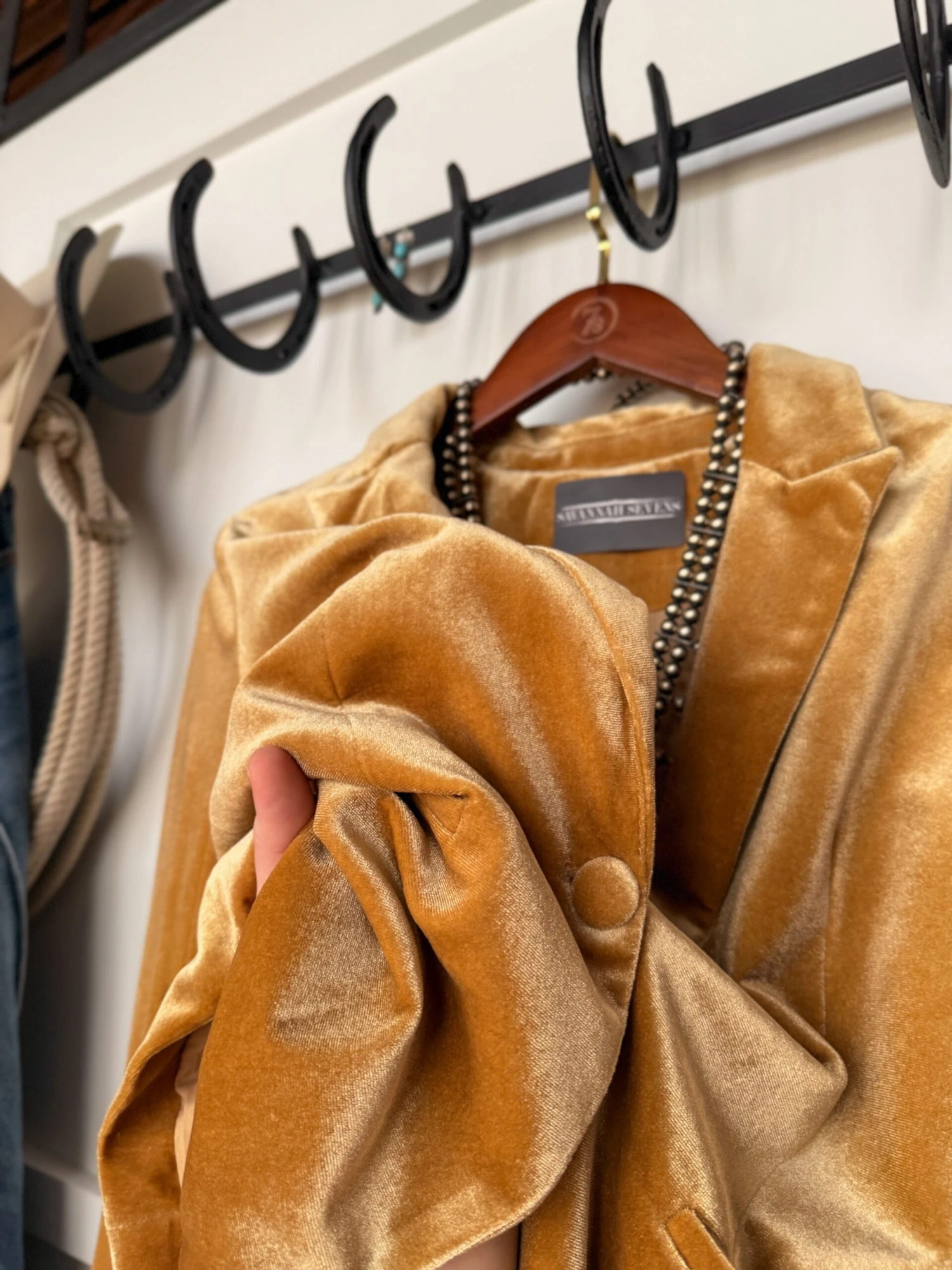 - Golden saddle tan velvet blazer.