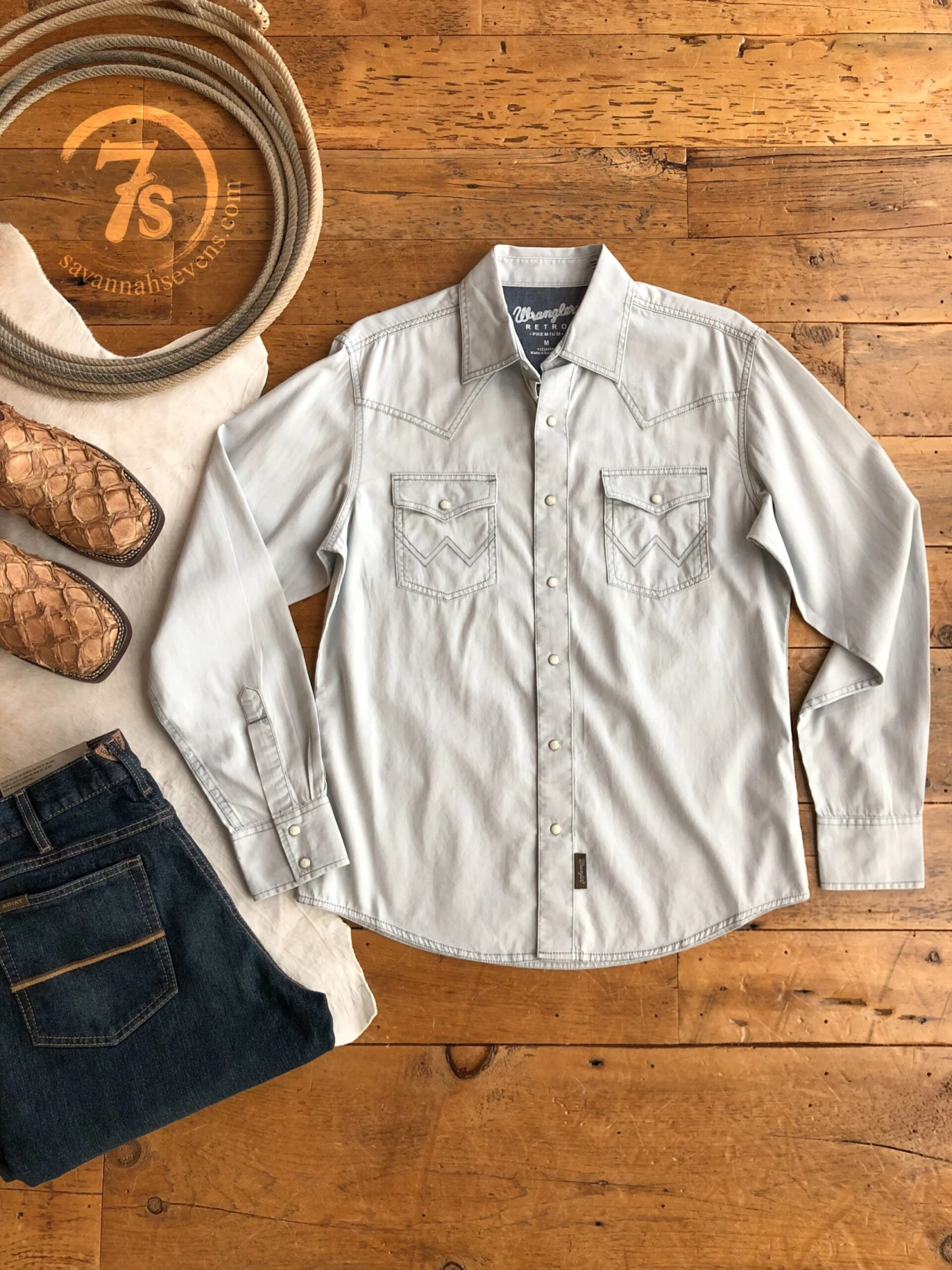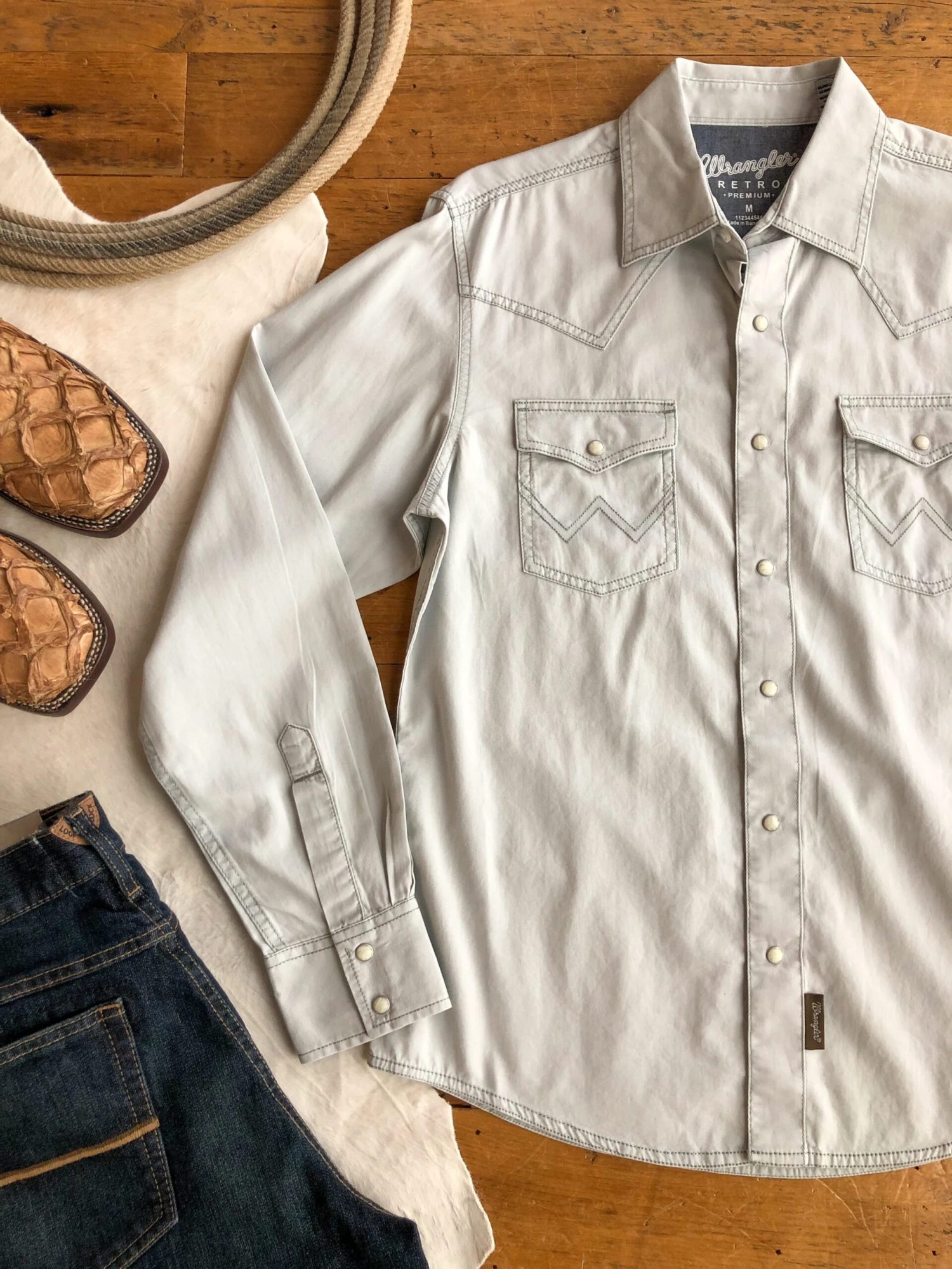 - Men’s light grey pearl snap long sleeve shirt.