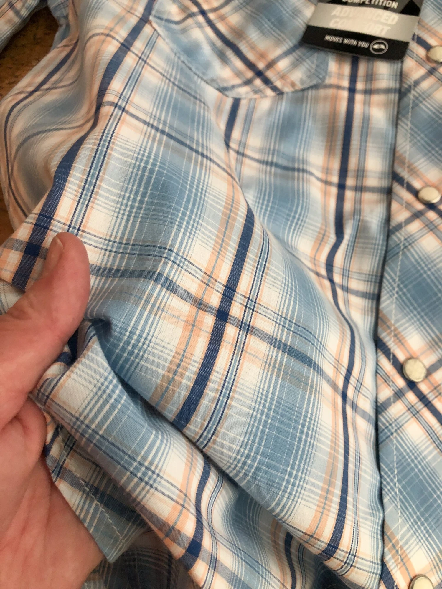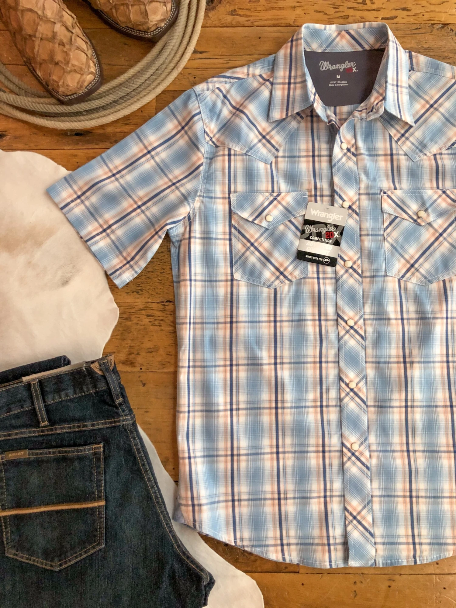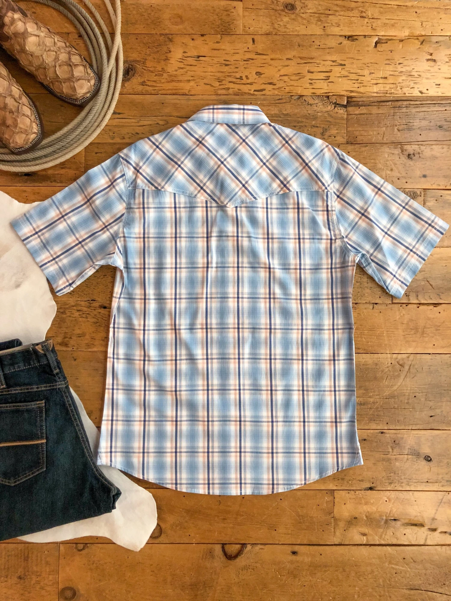 - Men’s short sleeve pearl snap shirt.