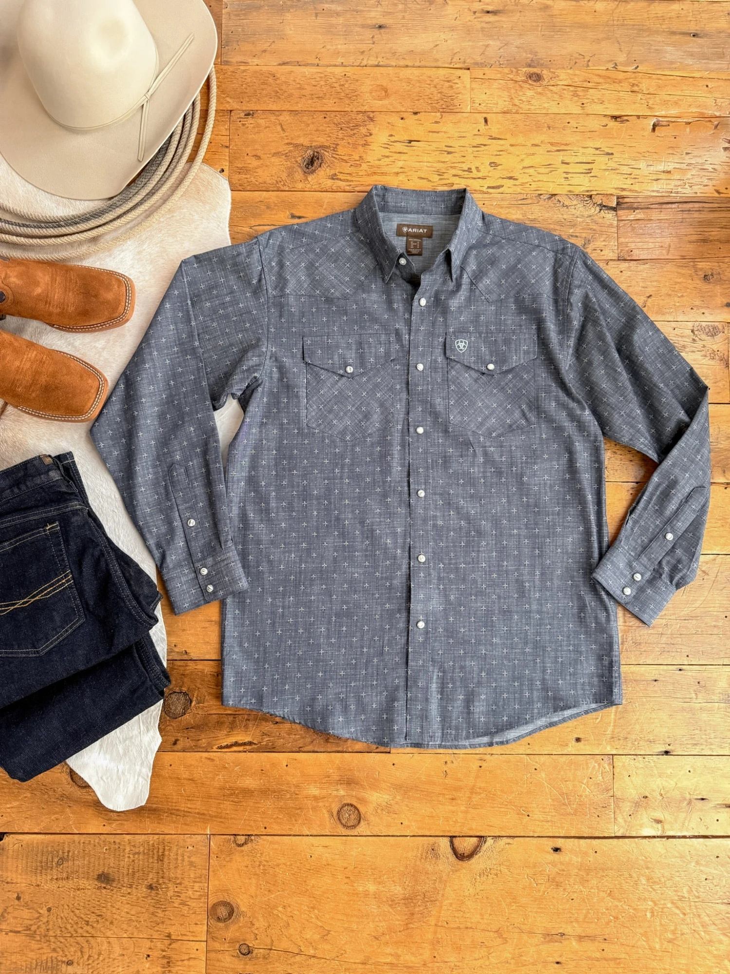 - Men’s long sleeve pearl snap shirt.