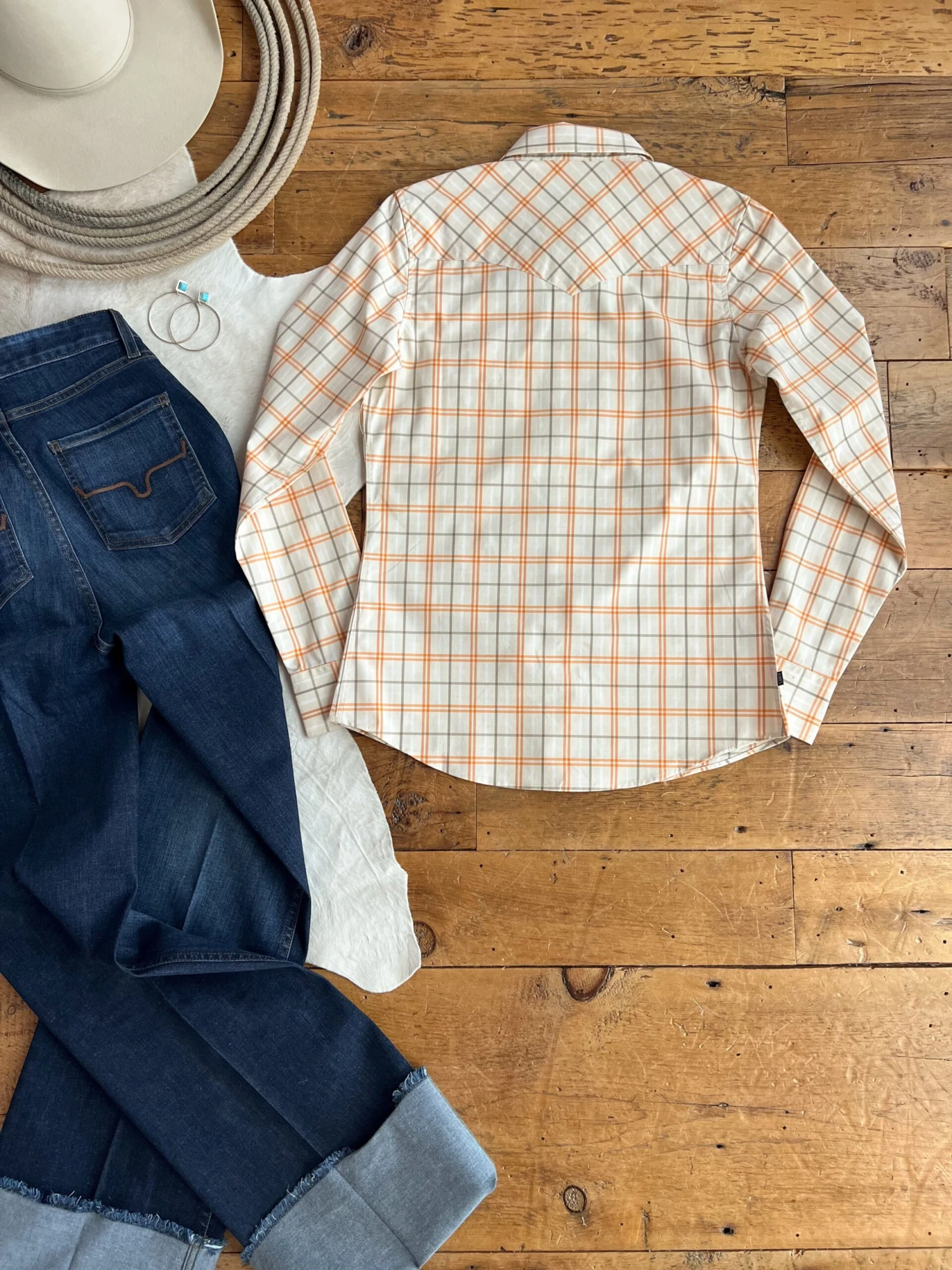 - Pale natural with orange, storm grey, and white plaid accents.