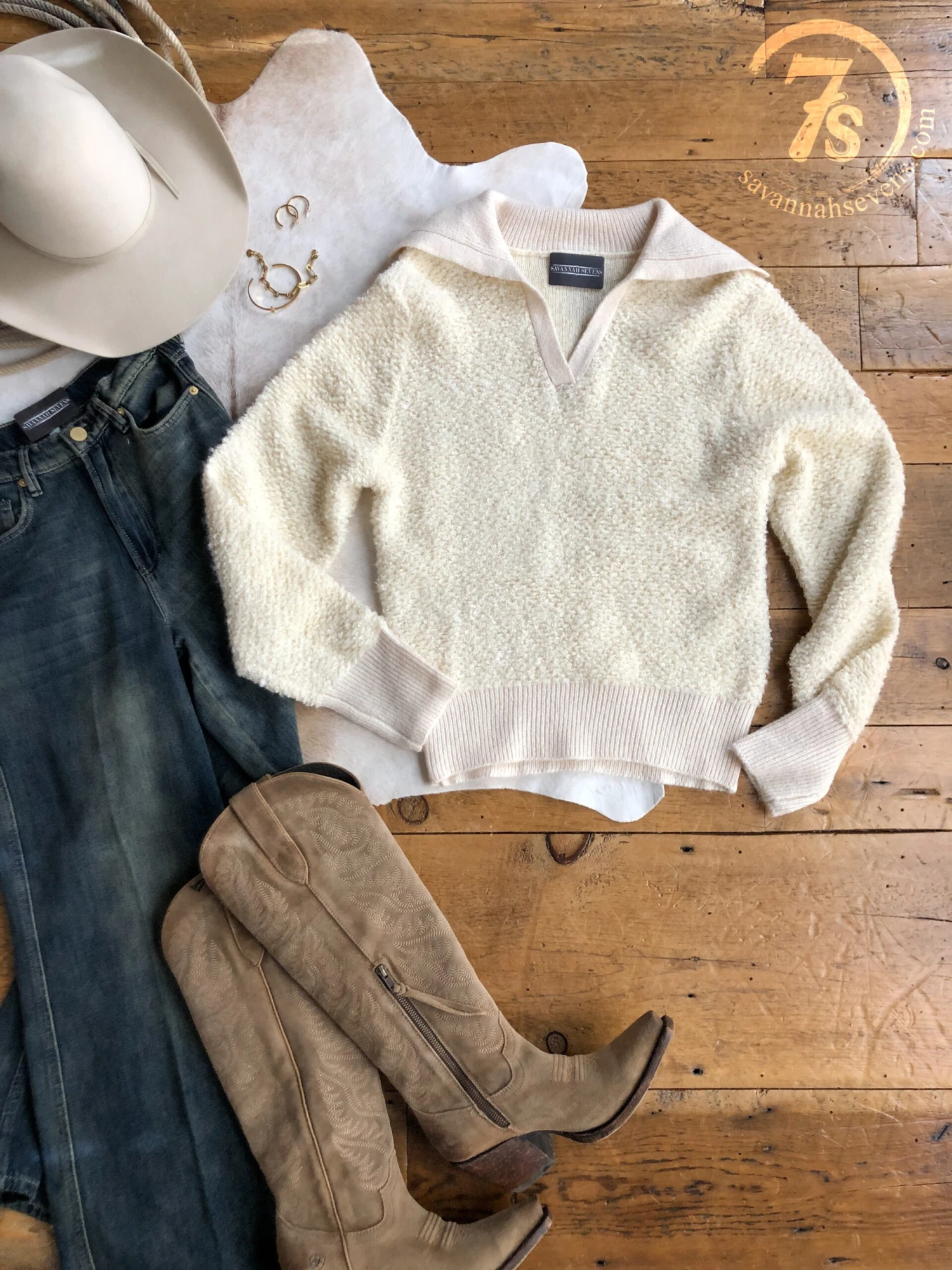 - Shown styled with The McKinney High Rise Wide Leg Jean, The Westly boots, Fairhaven Cuff, Larkin Bracelet, and Posen Earrings.