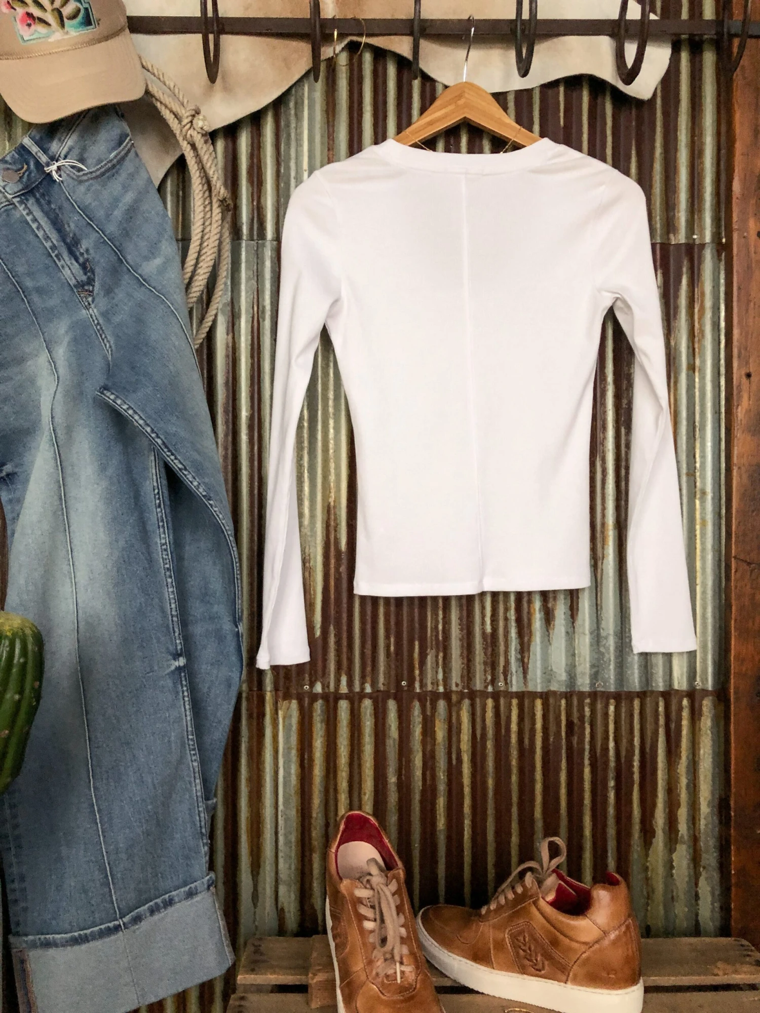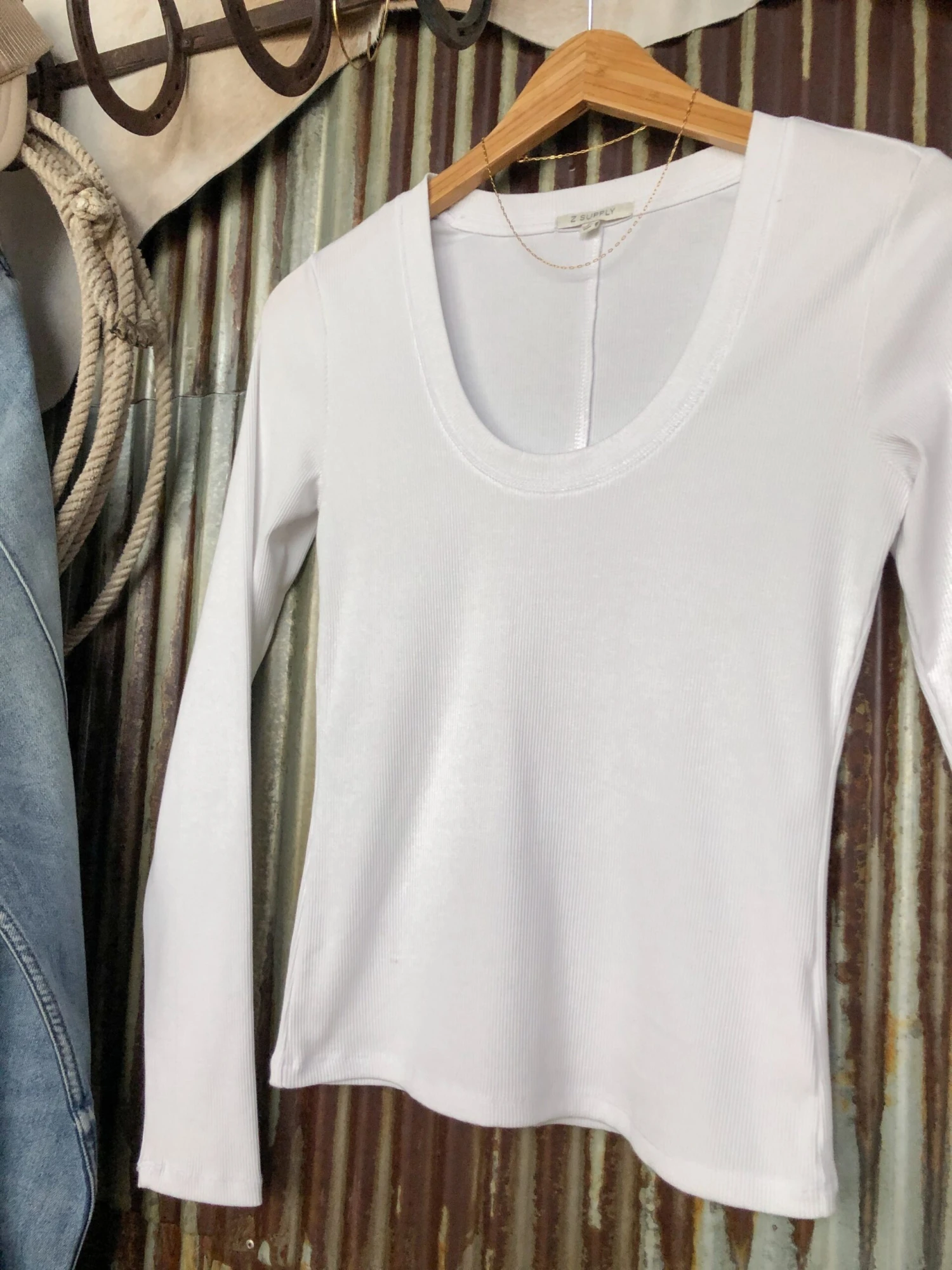 - White ribbed long sleeve top.