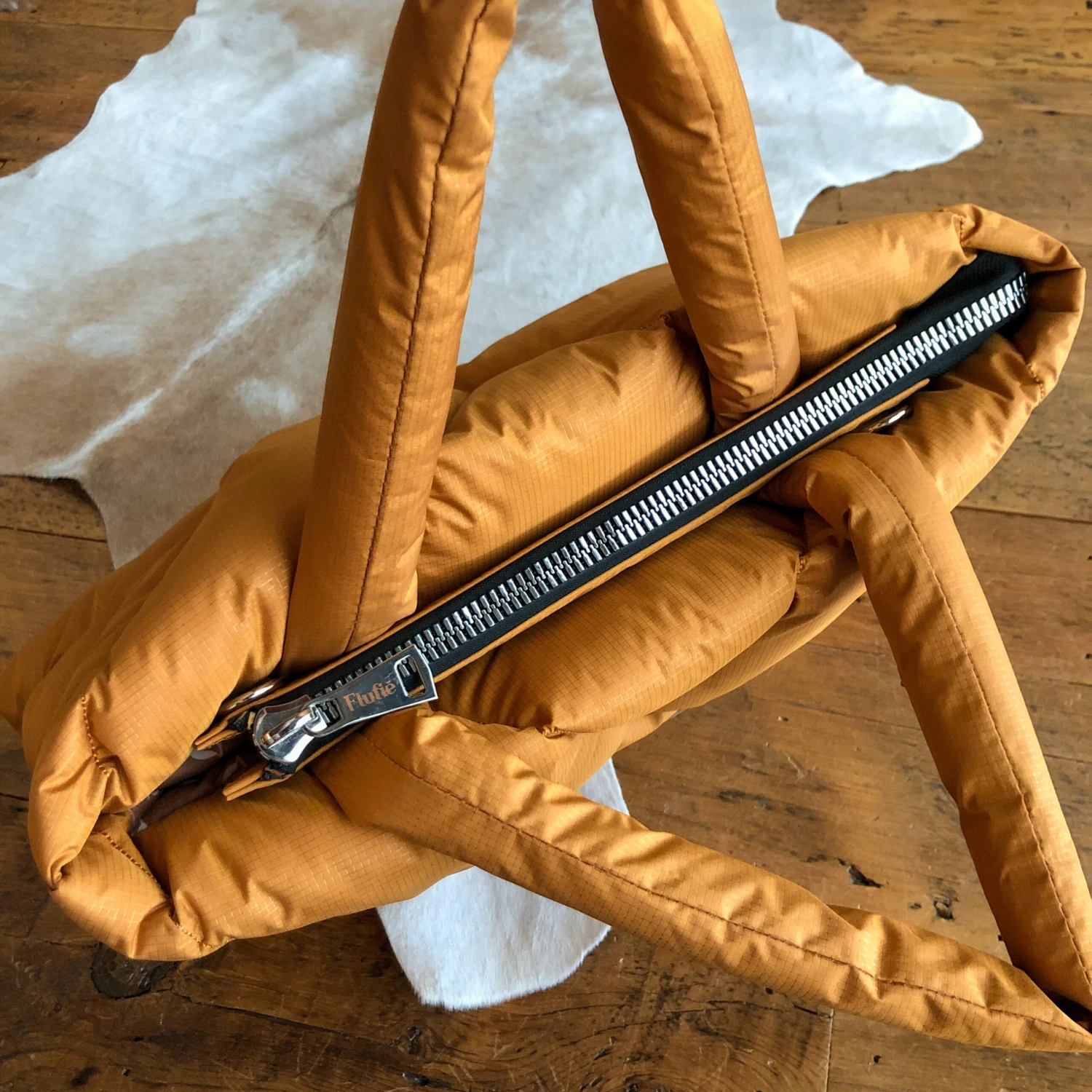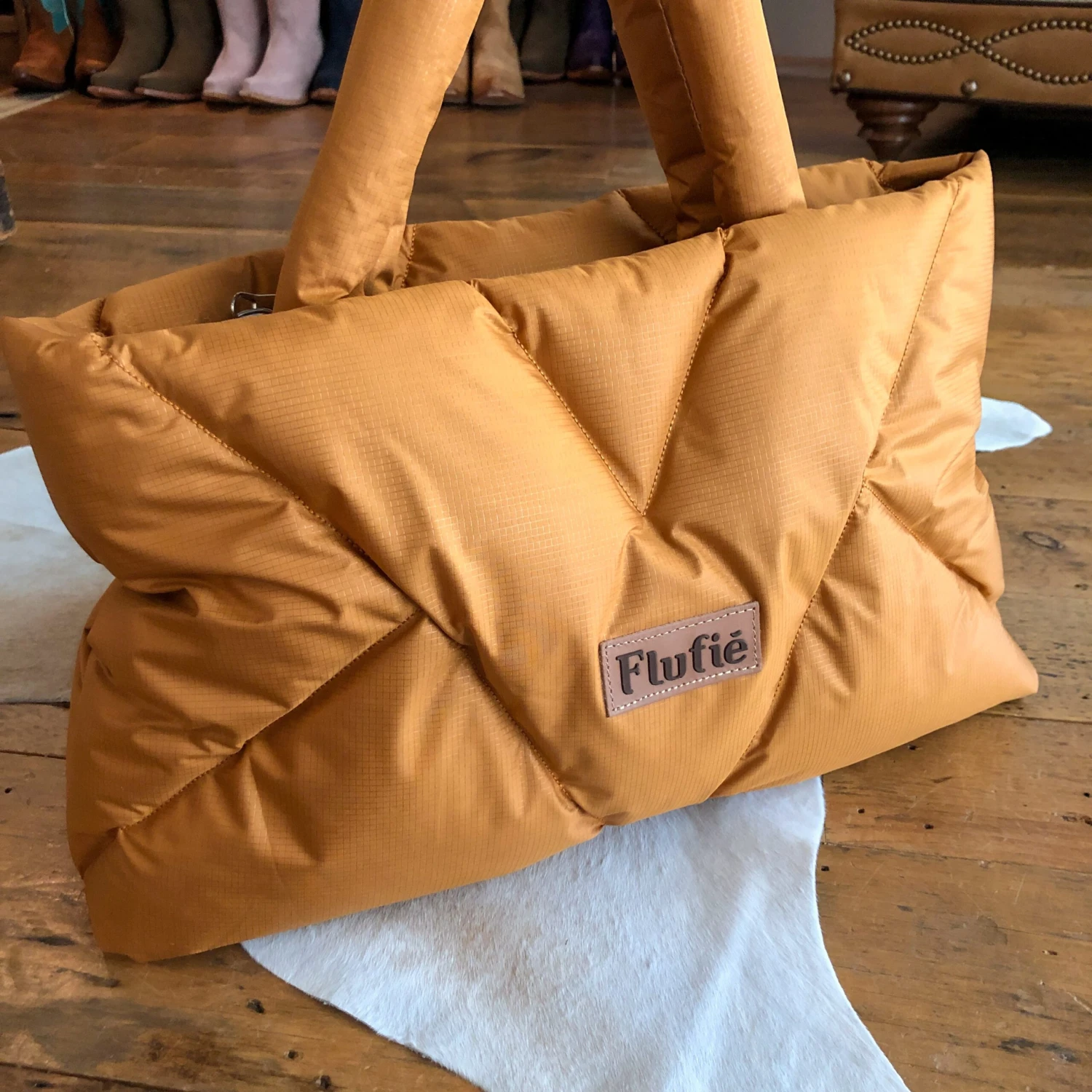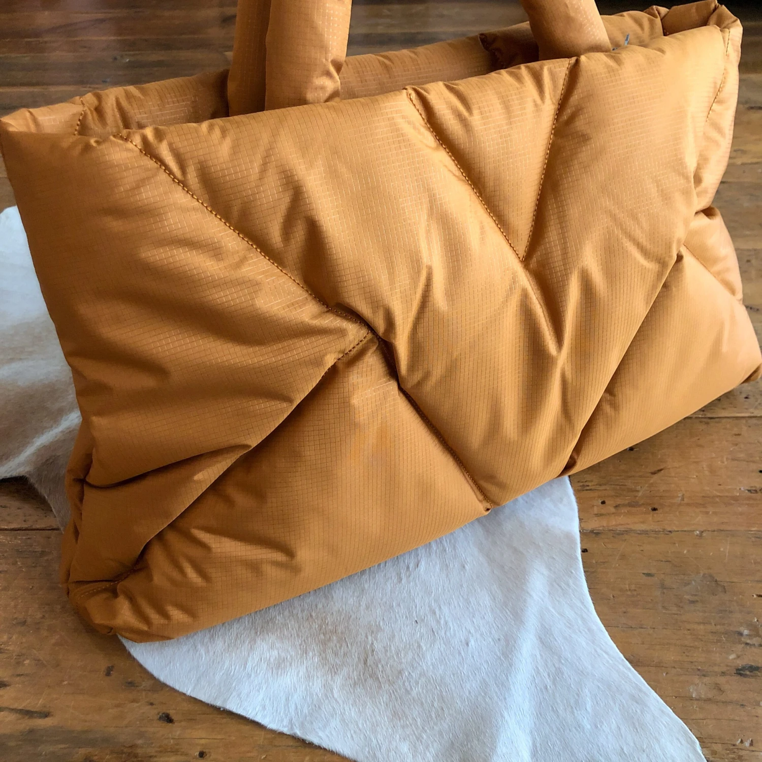 - Golden saddle tan puffer handbag.