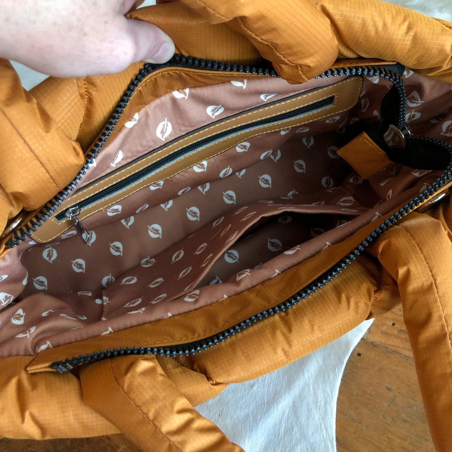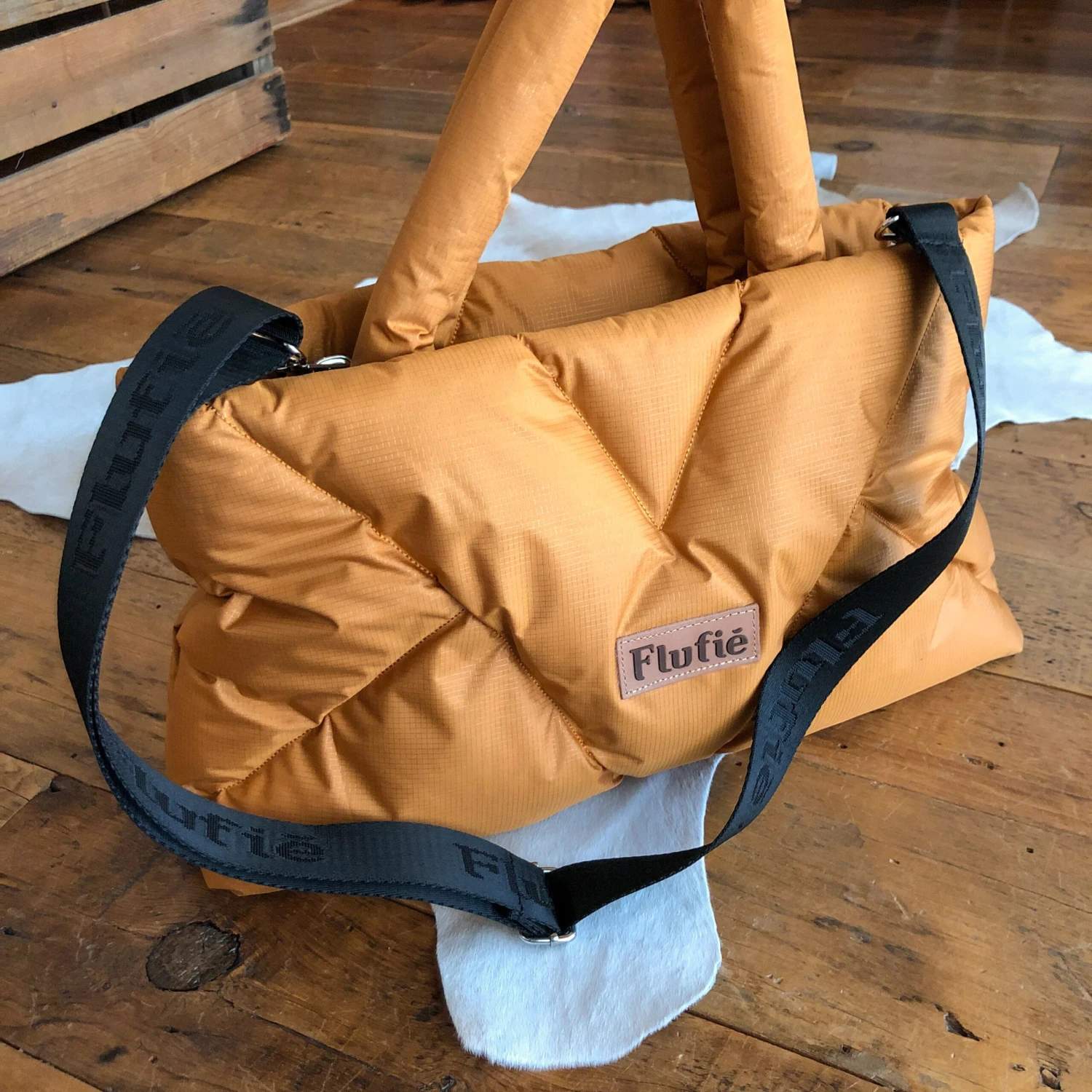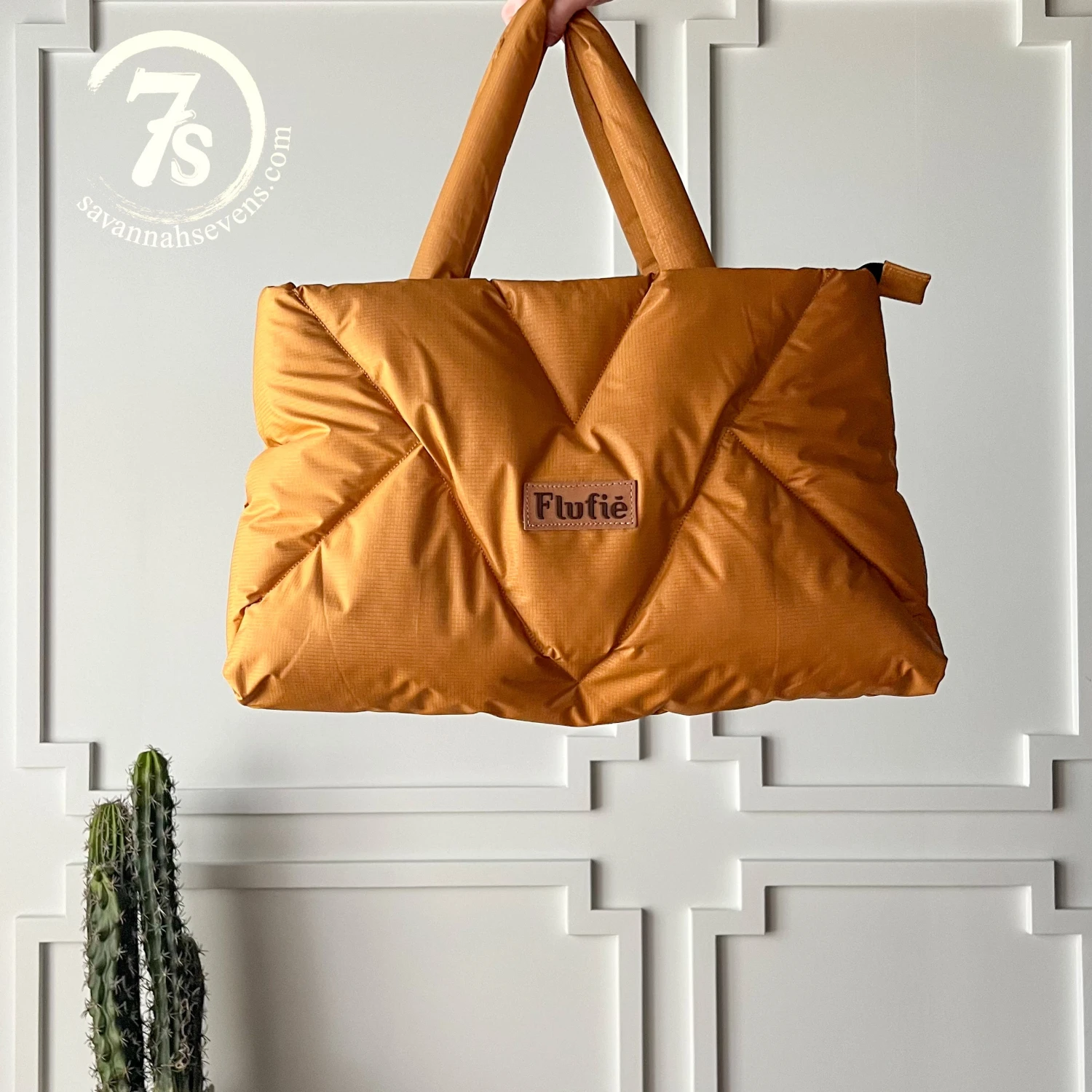 - Golden saddle tan puffer handbag.