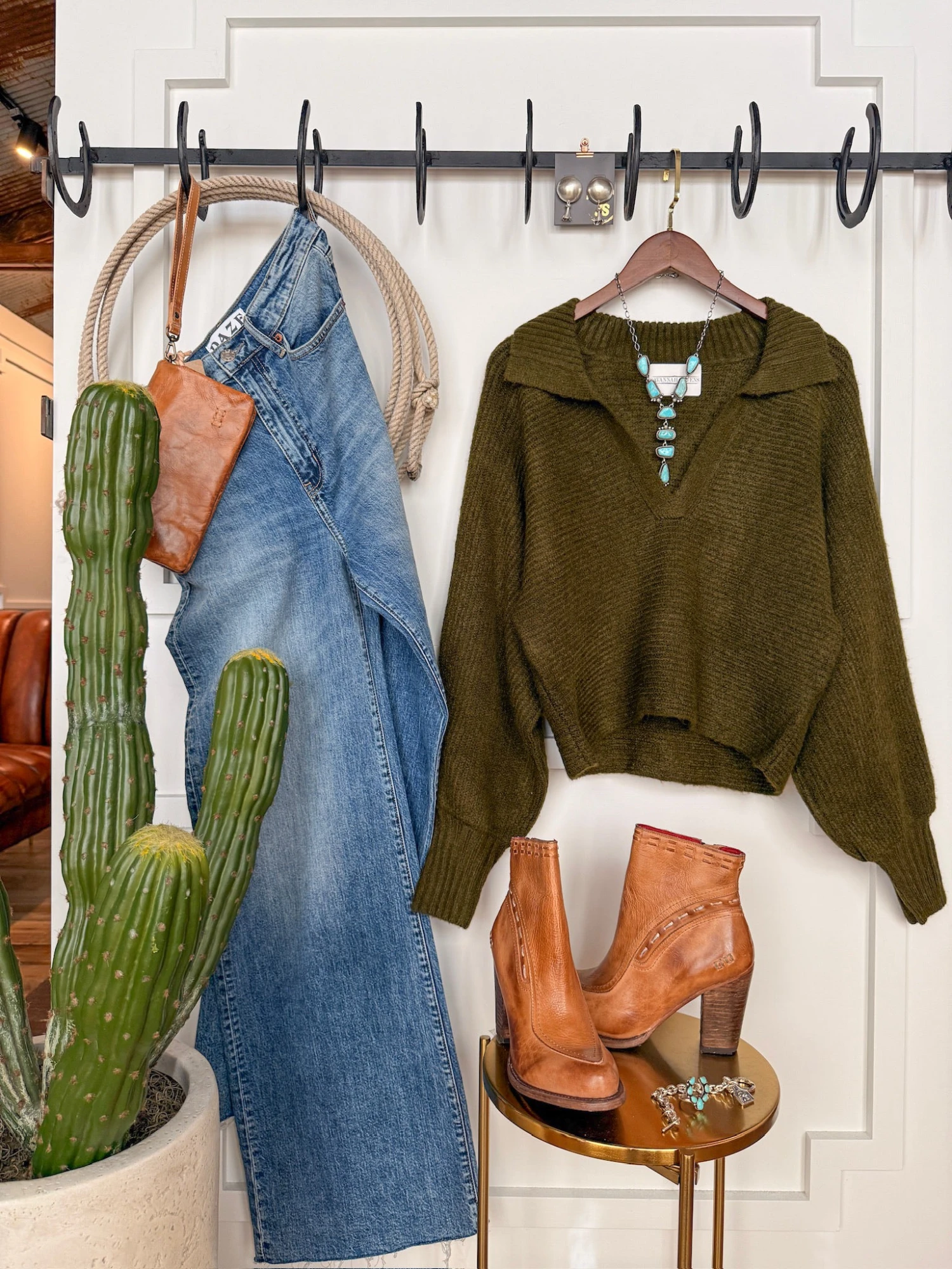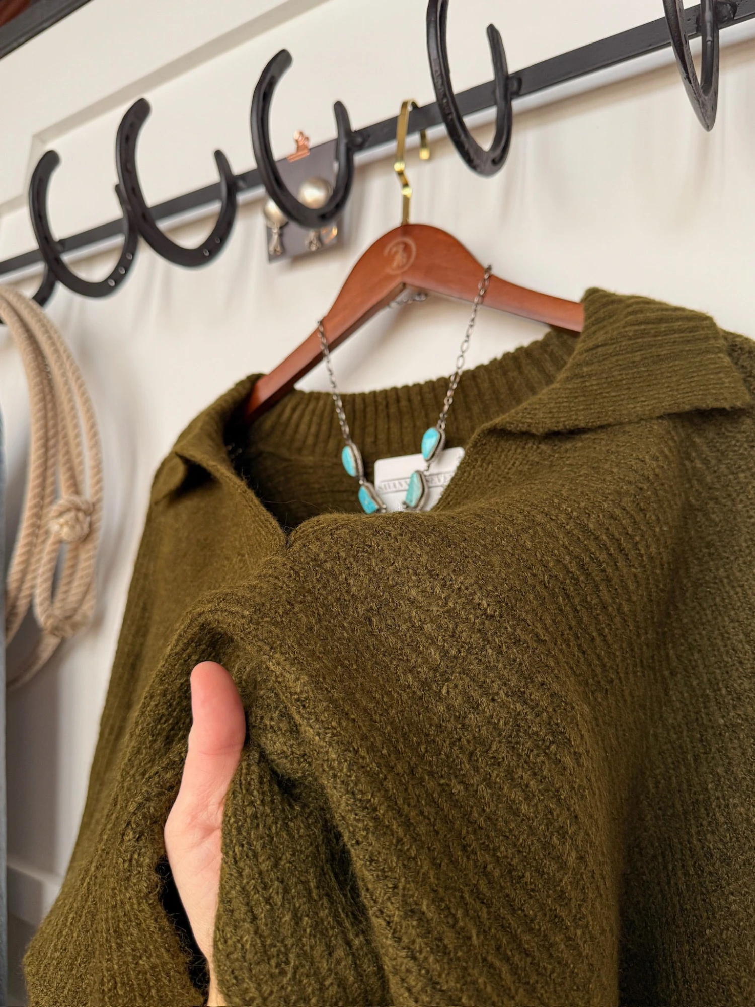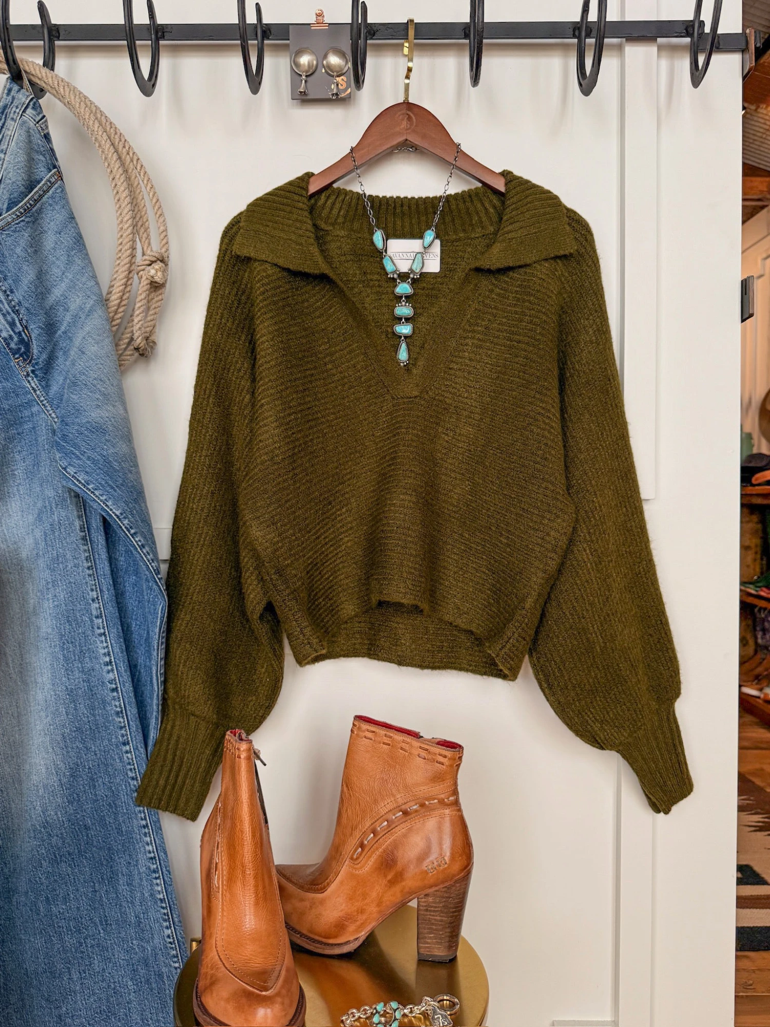 - Deep olive long sleeve top.