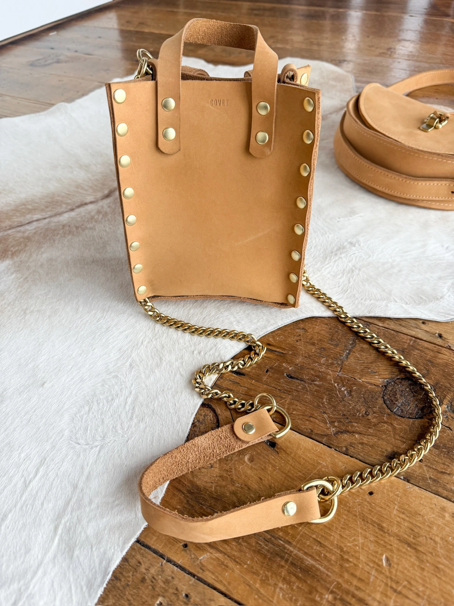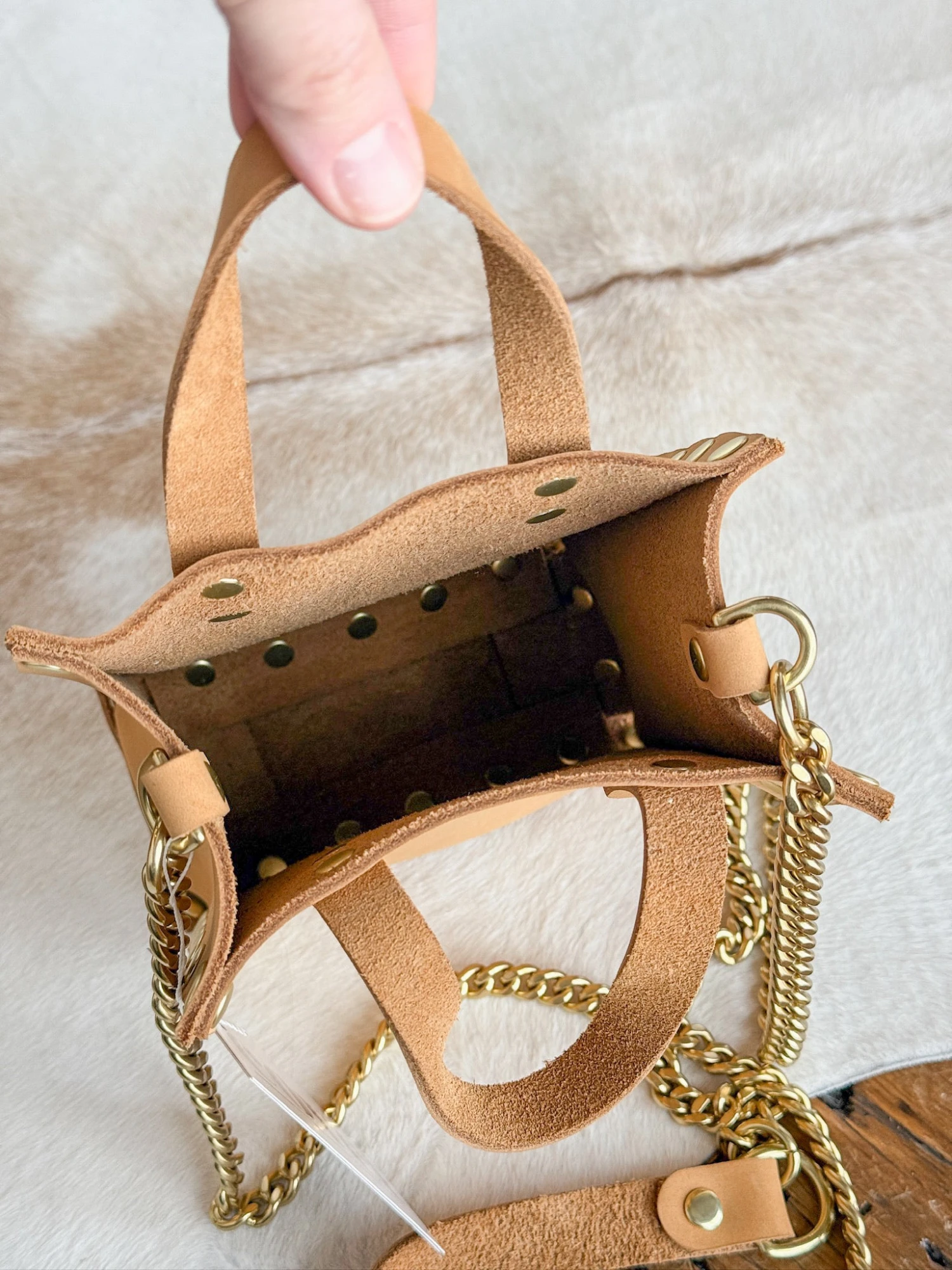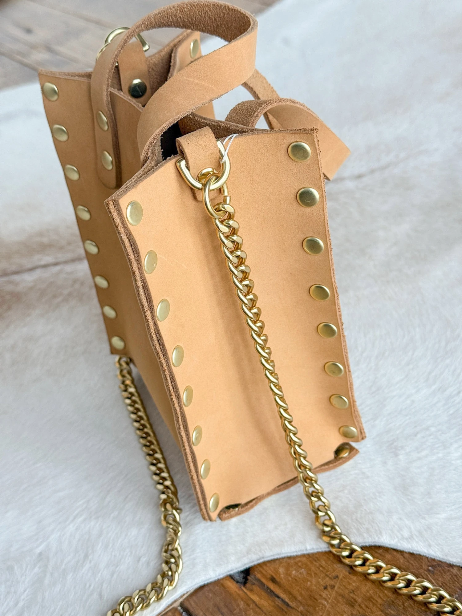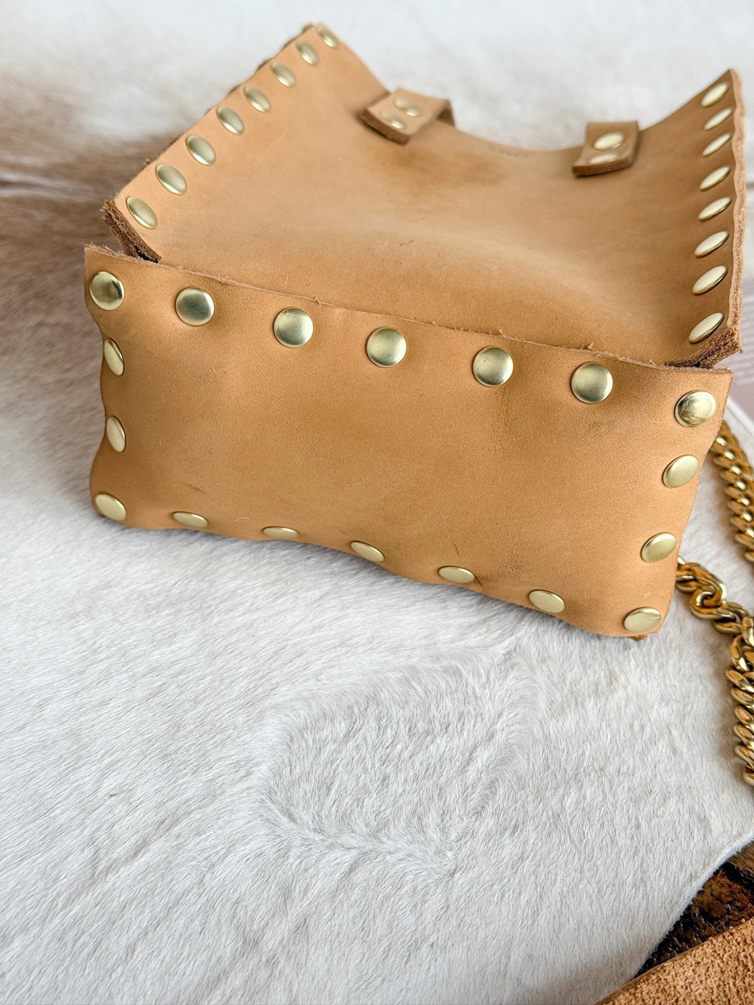 - Brass stud detail throughout.