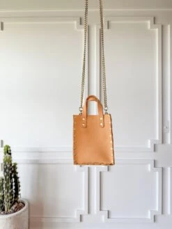 - Saddle tan leather crossbody handbag.