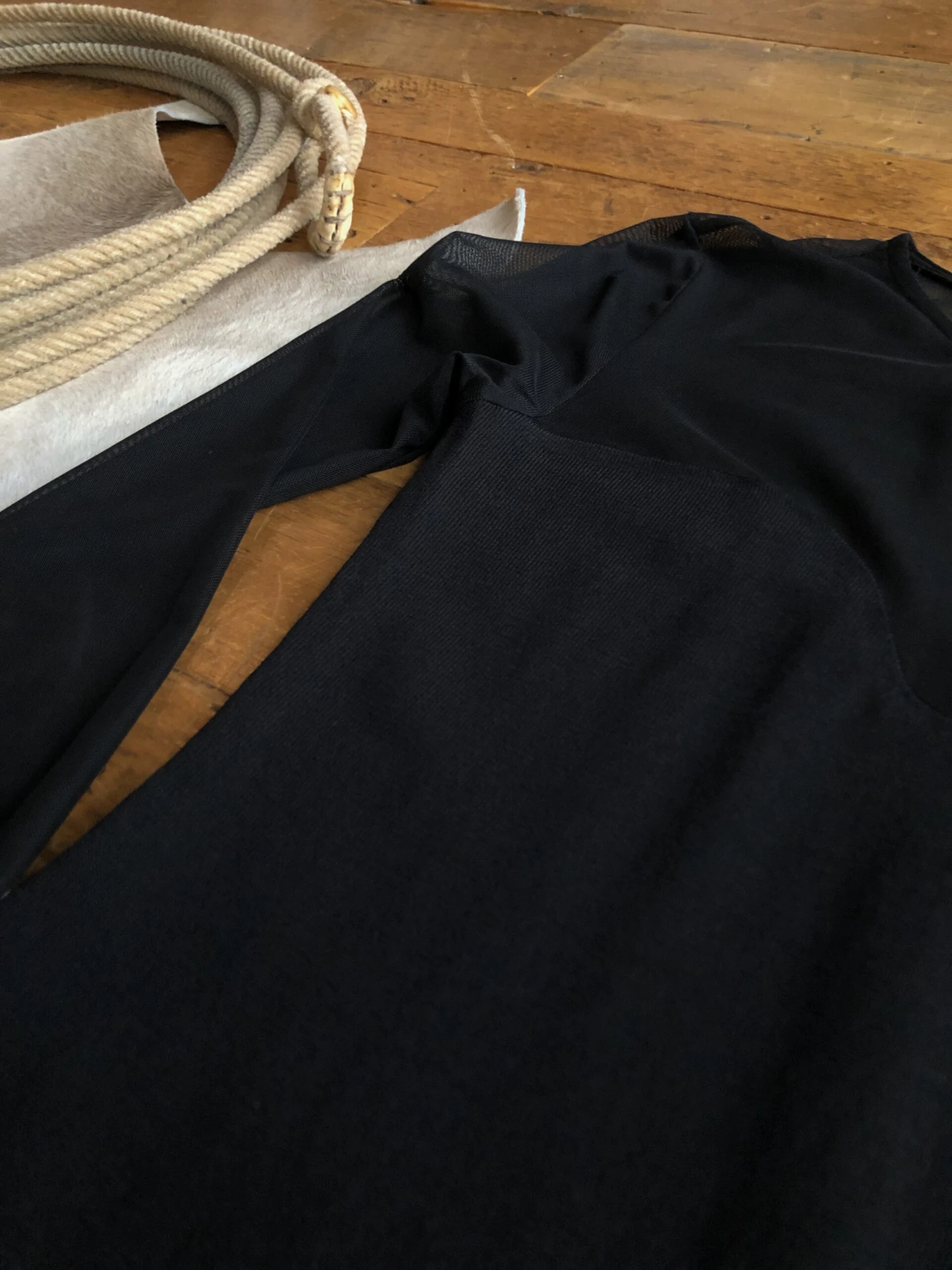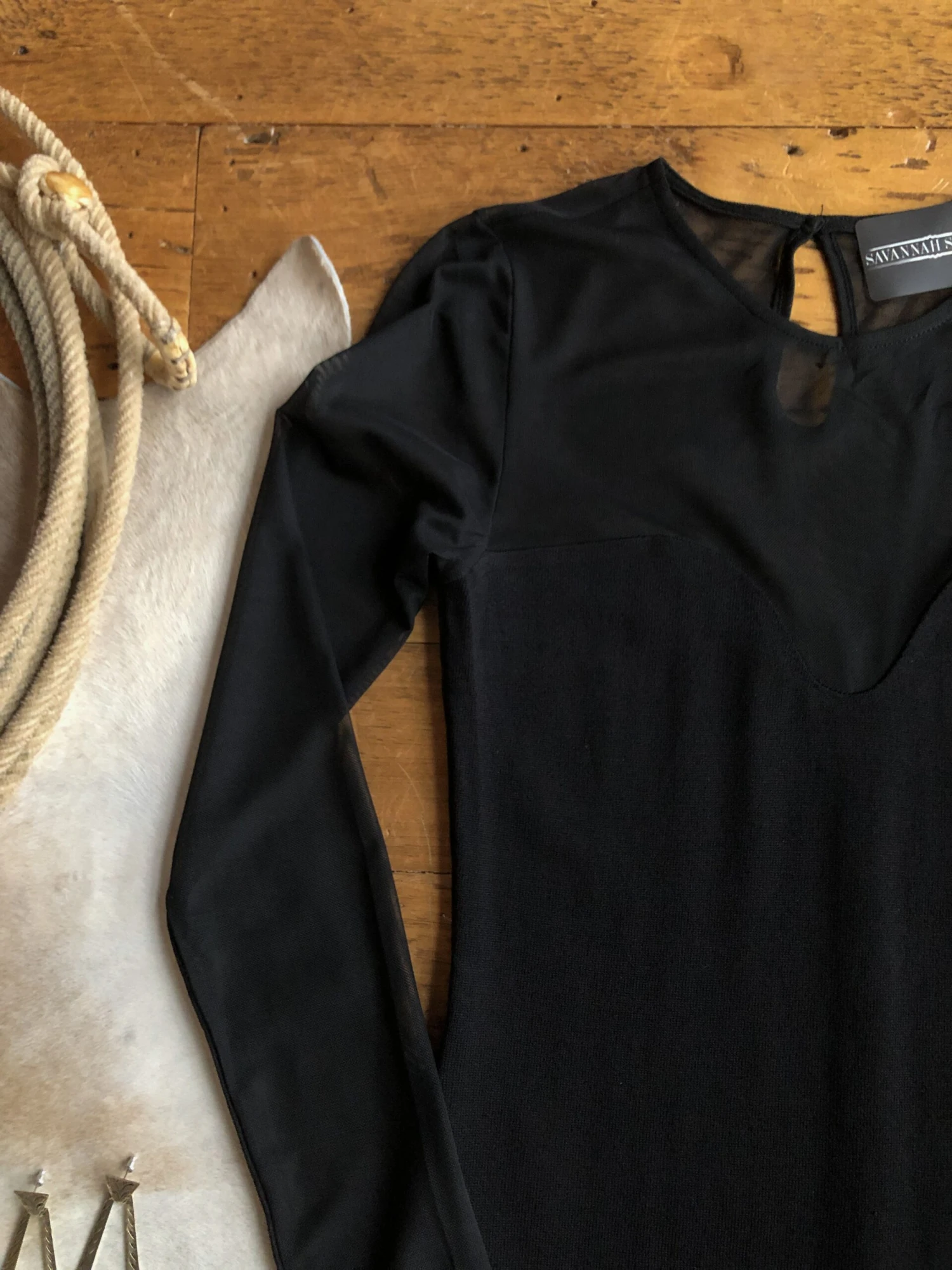 - Black mesh sleeves and yoke that create a sweetheart neckline.