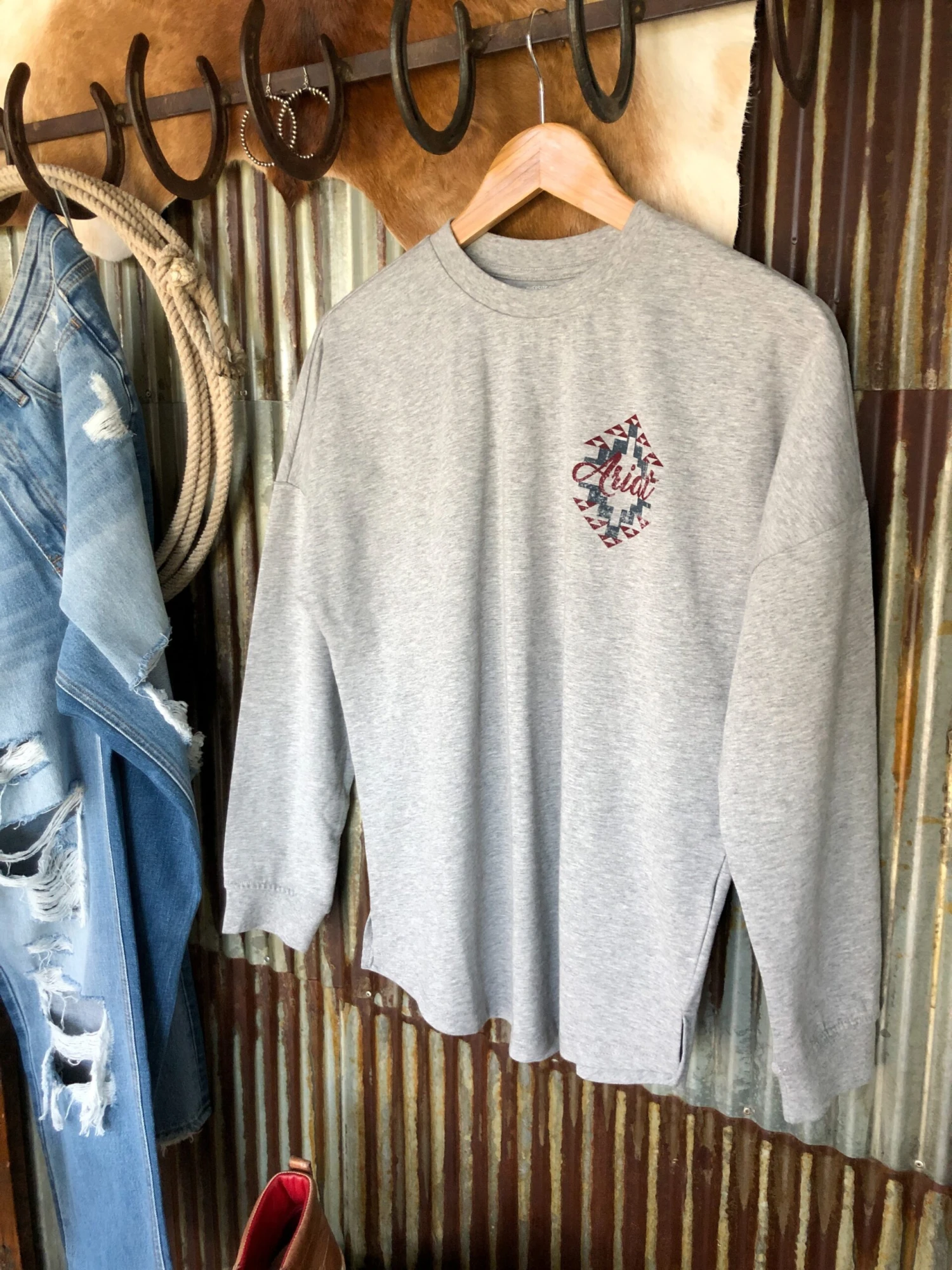 - Heather grey long sleeve Ariat logo top.