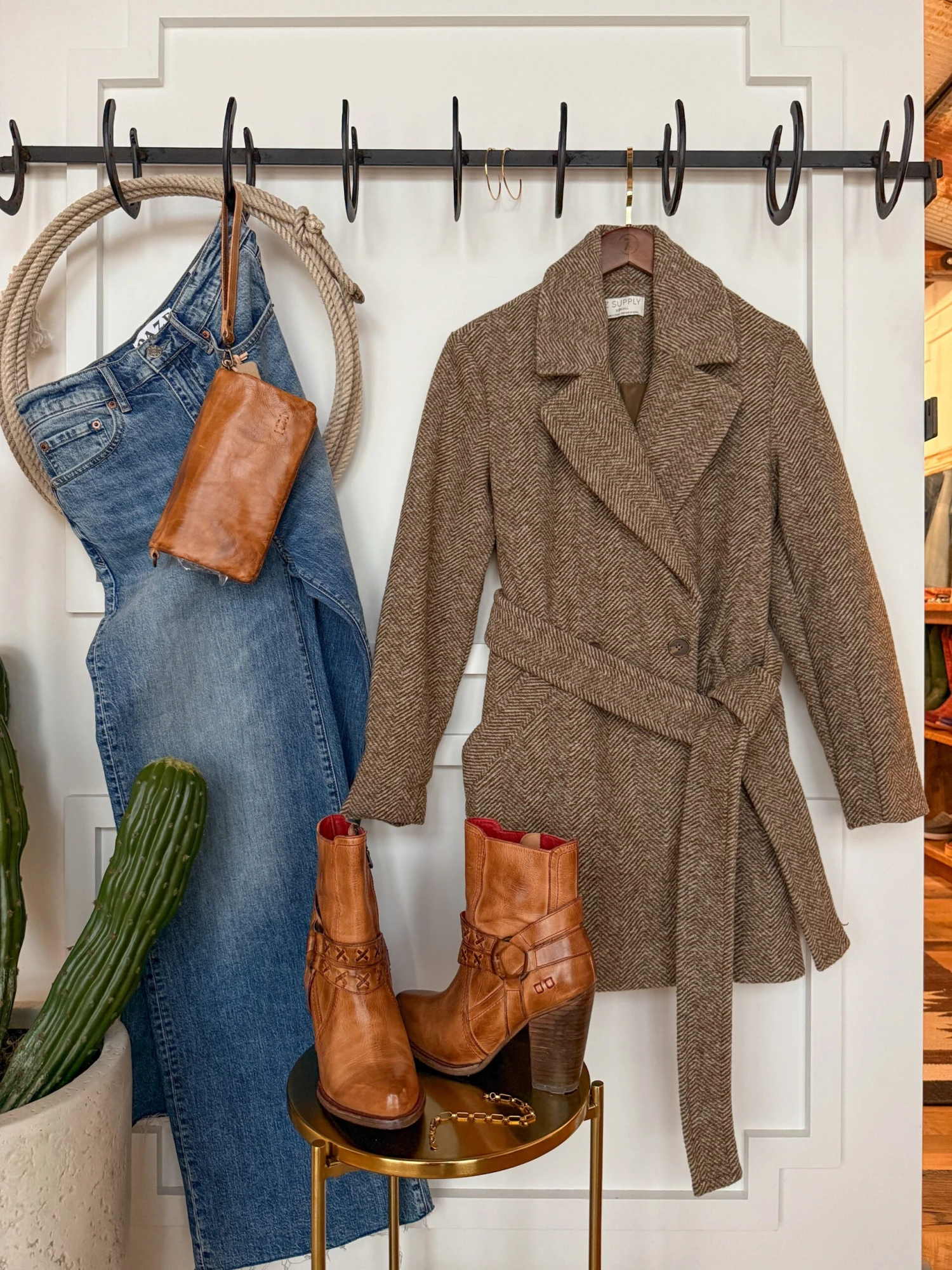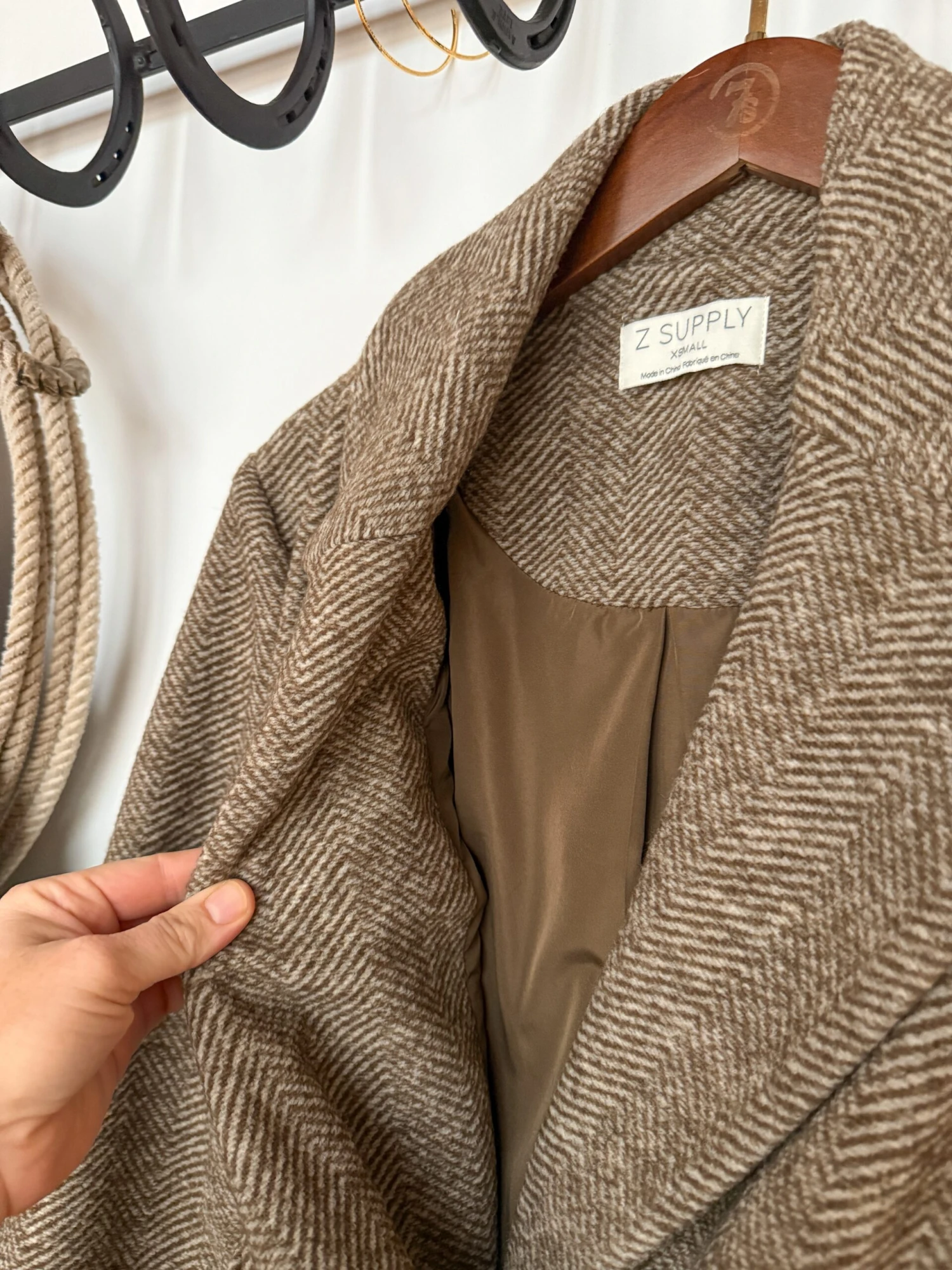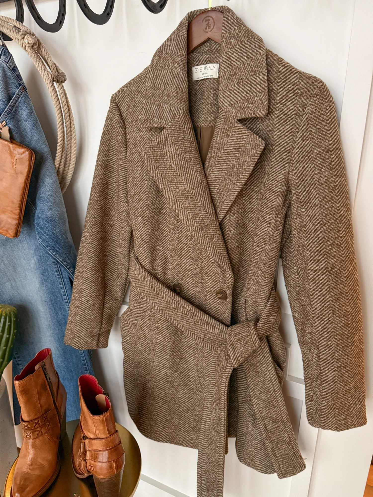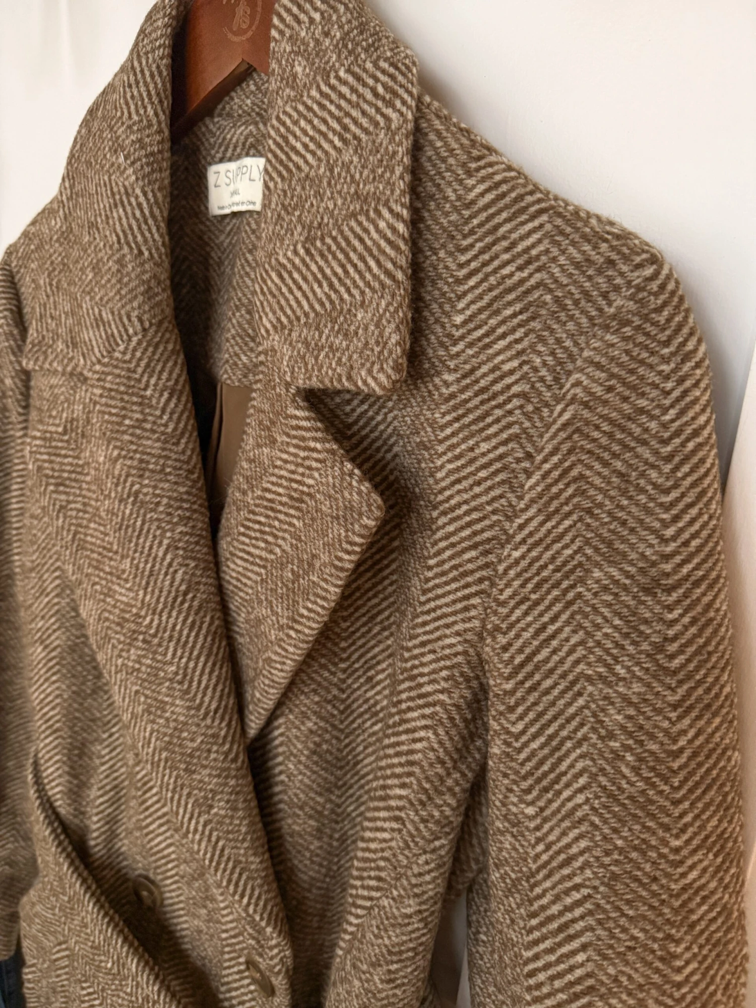 - Herringbone pattern long coat.