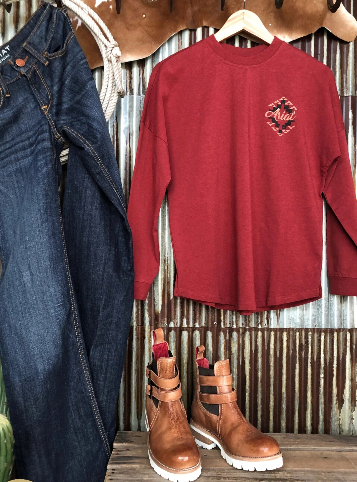- Heather dark red long sleeve Ariat logo top.