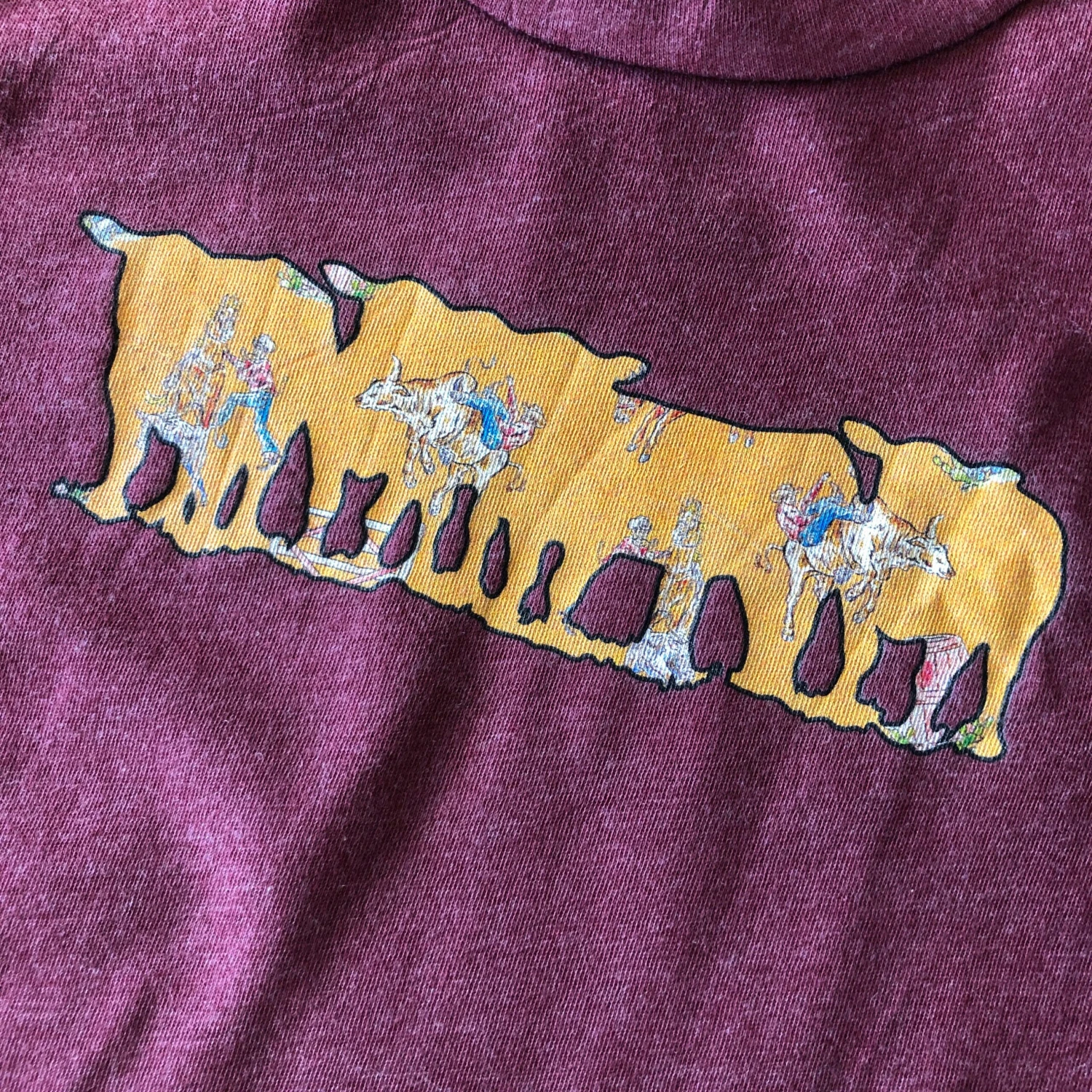 - Cattle herd graphic with vintage rodeo scenes inside.