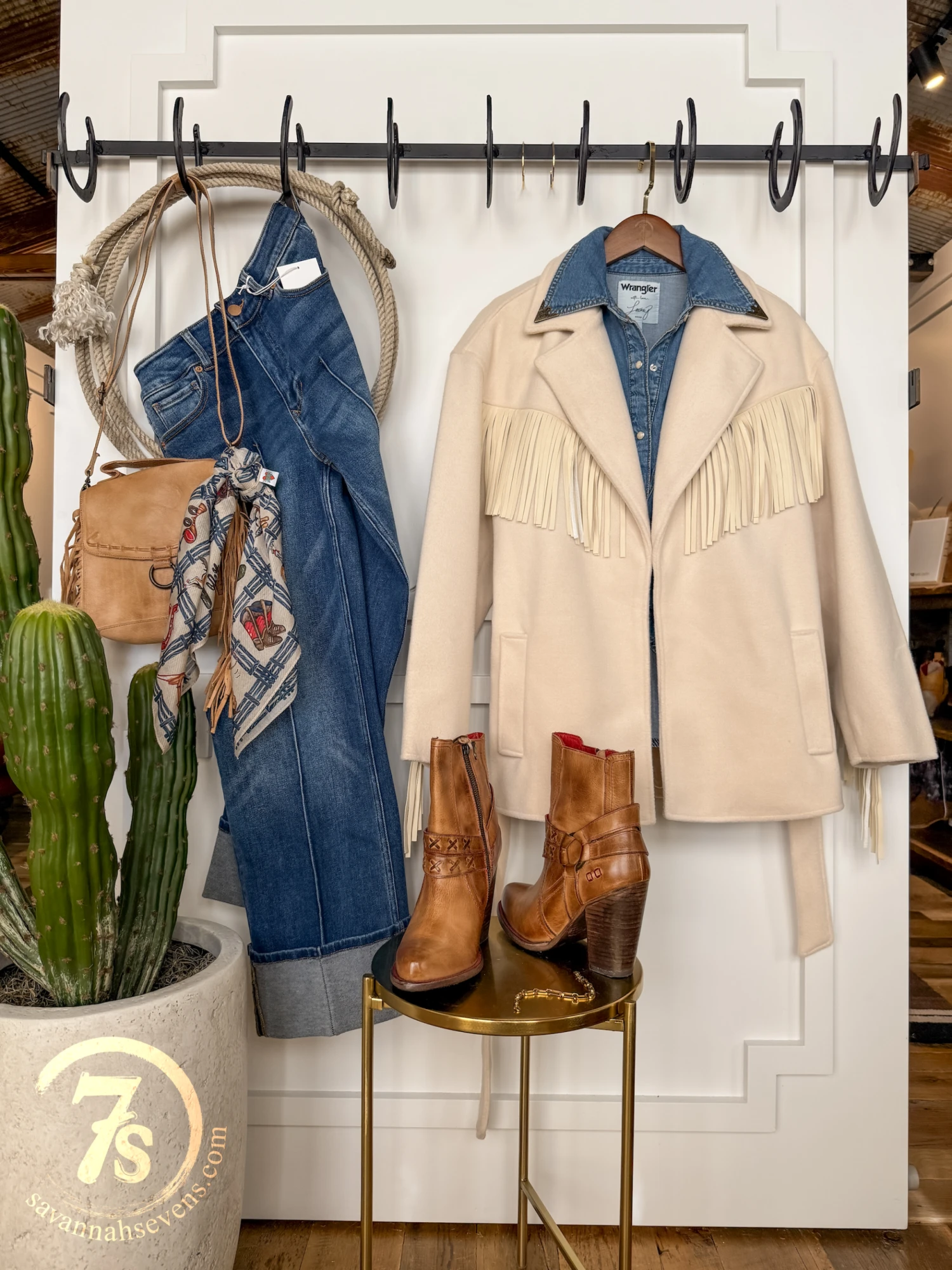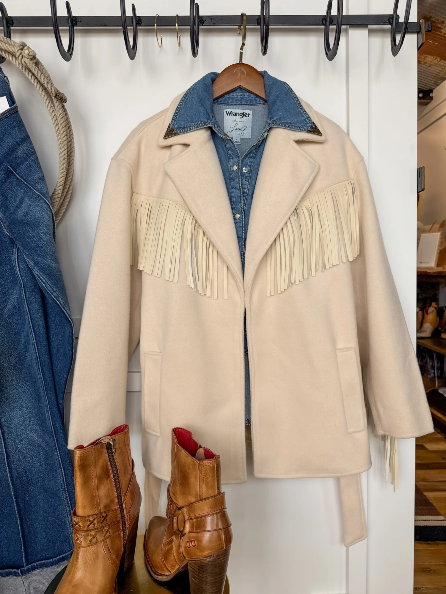 - Faux leather fringe western style yoke that continues down the back of the sleeves.