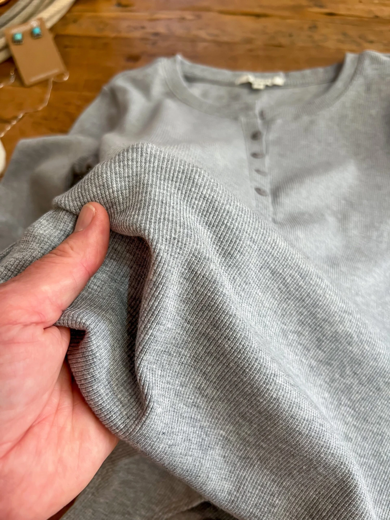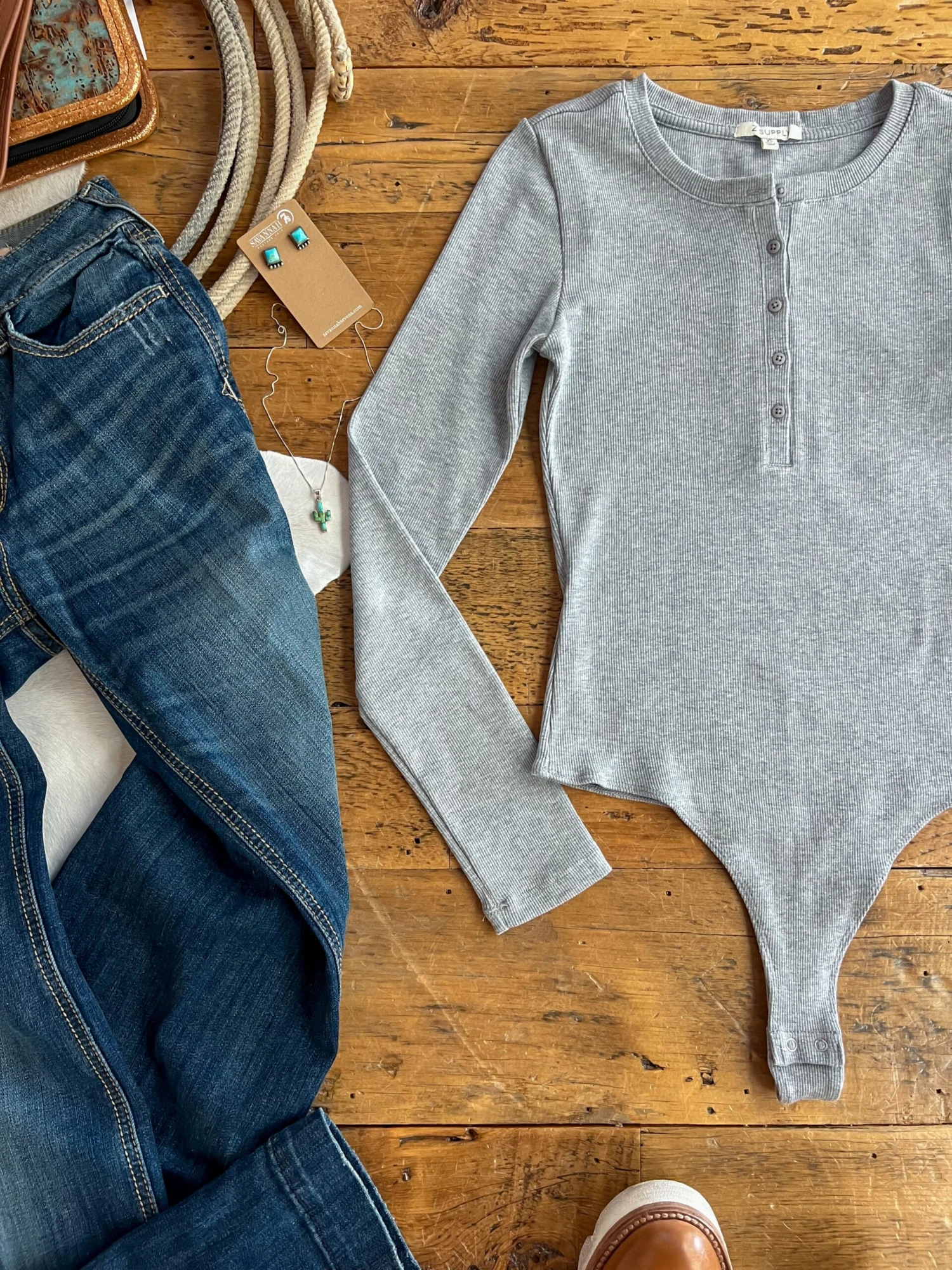 - Heather grey long sleeve quarter summary modal bodysuit.