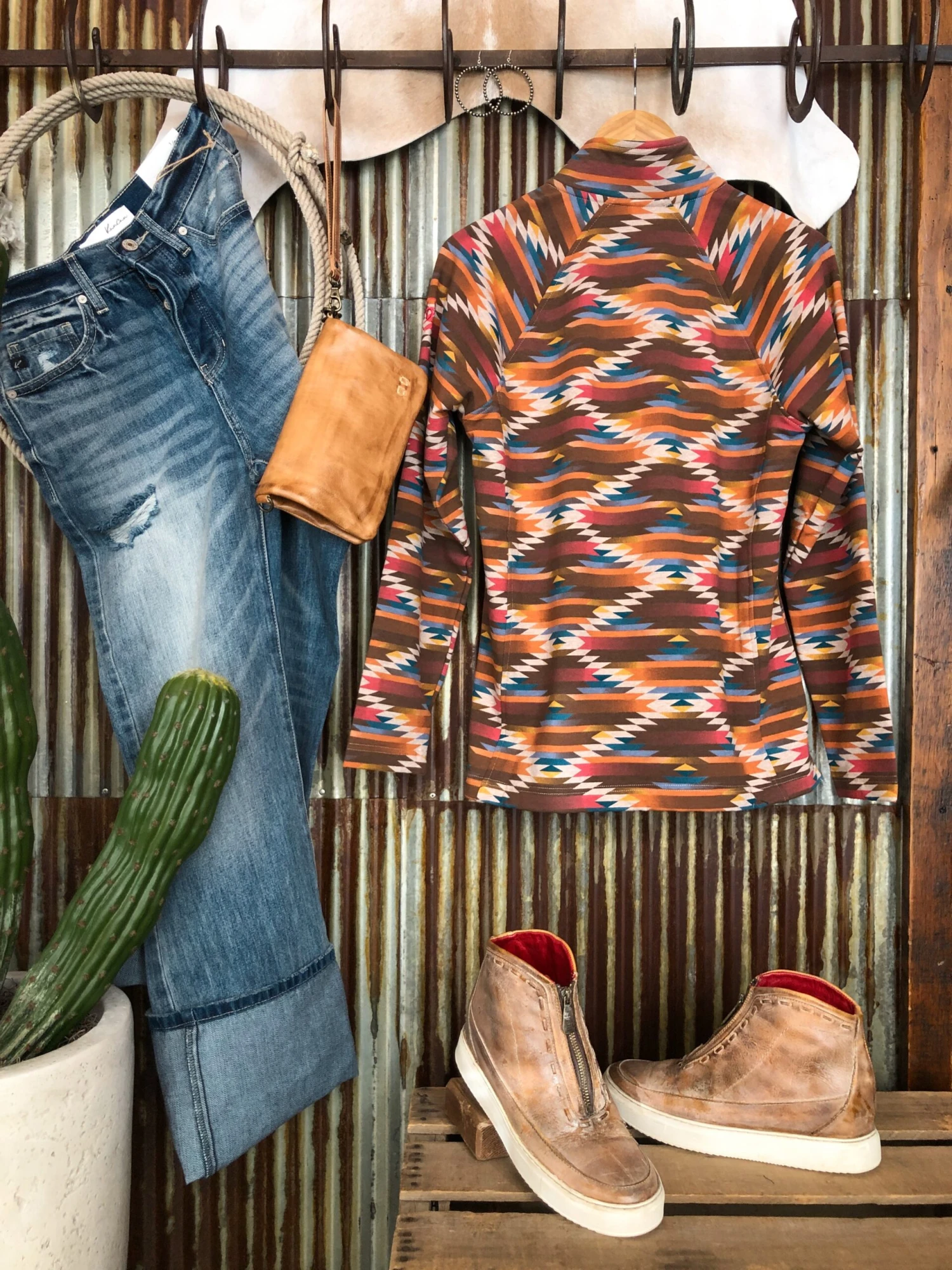 - Shown styled with The Trace High Rise 90’s Wide Leg Jean, The Kayde shoes, and The Roca crossbody wristlet.