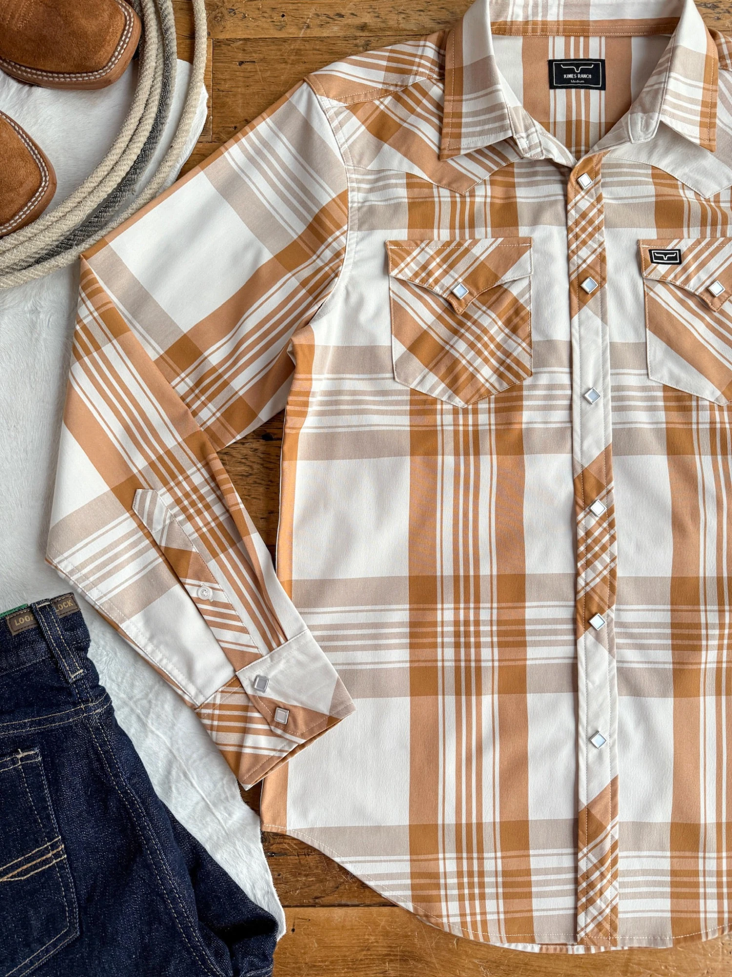 - Western snap summary chest pockets with a rubber Kimes Horns logo patch.
