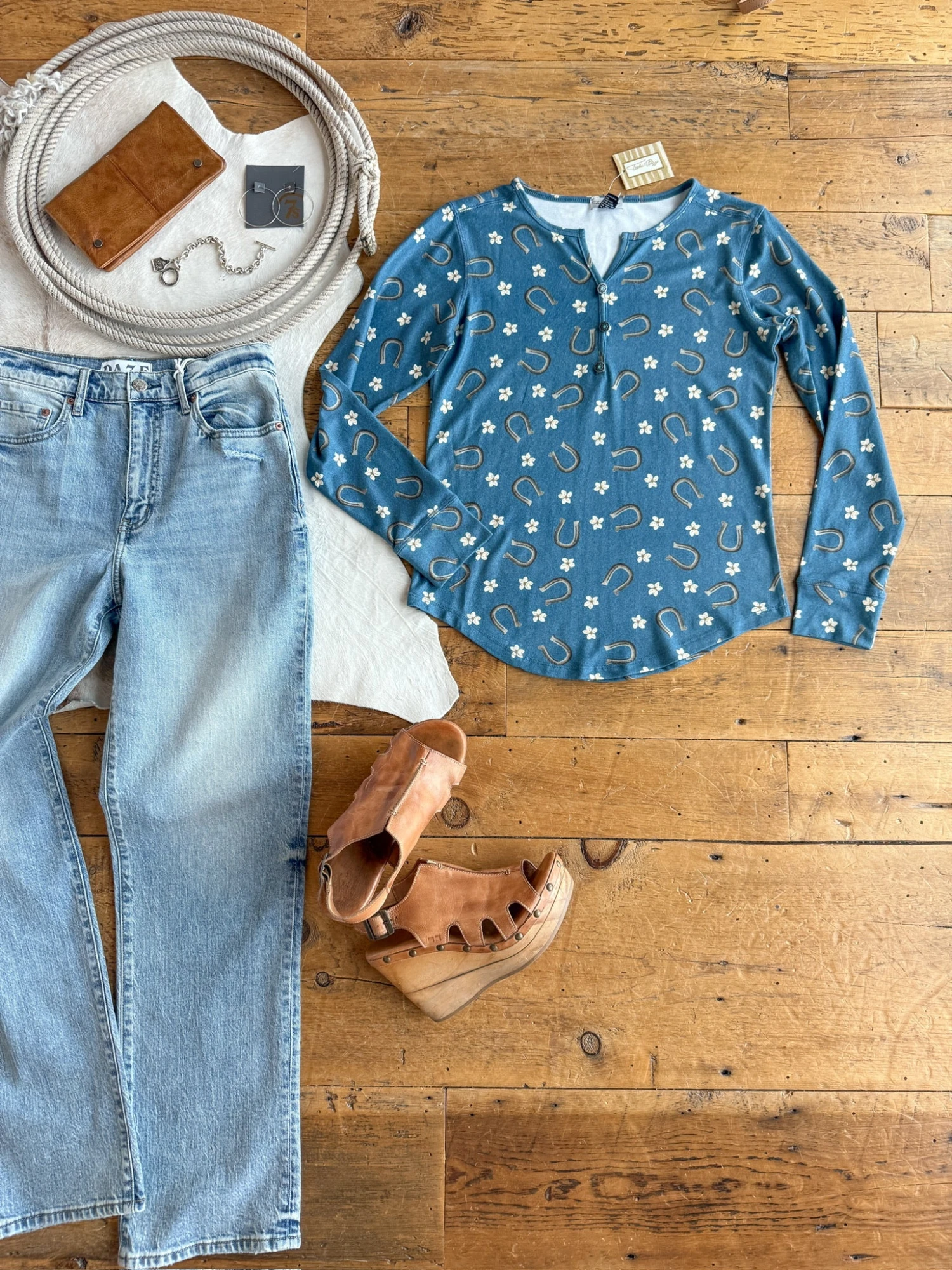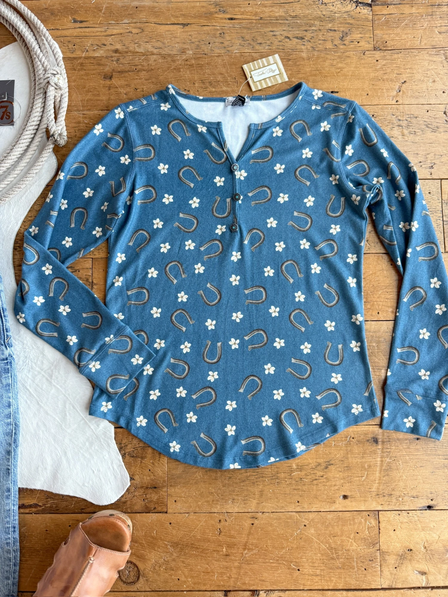 - Teal blue henley top.