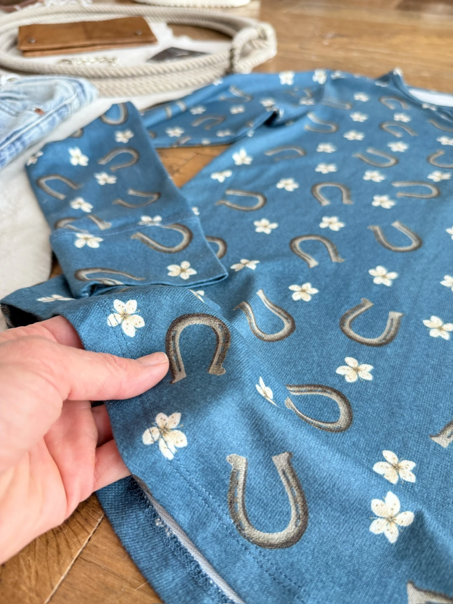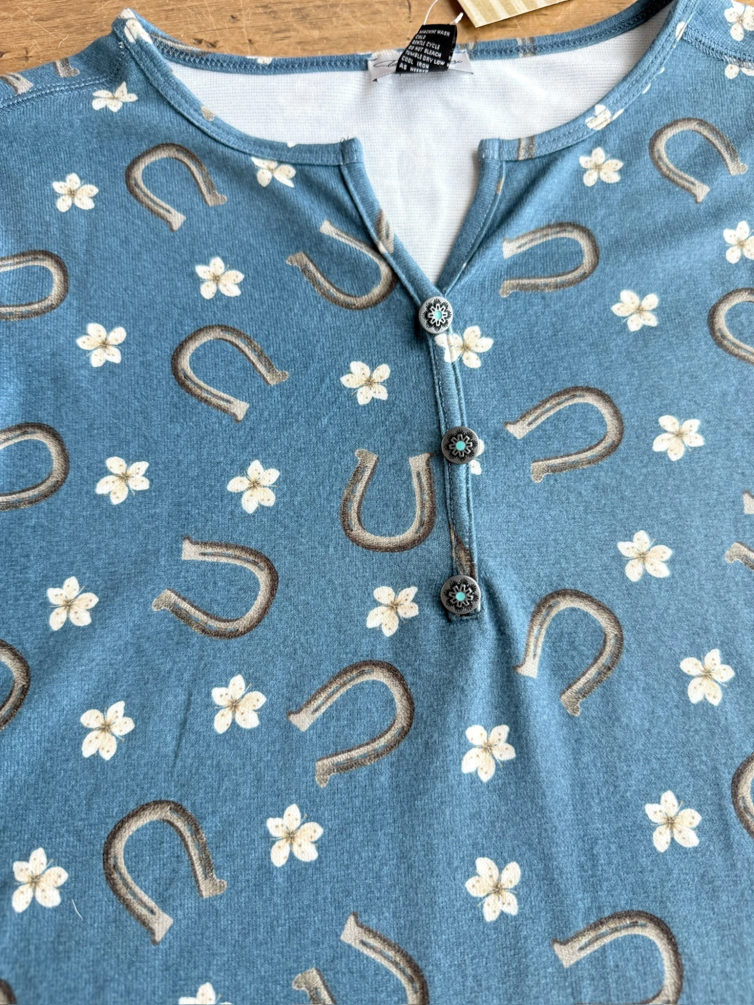 - Floral and horseshoe pattern throughout.