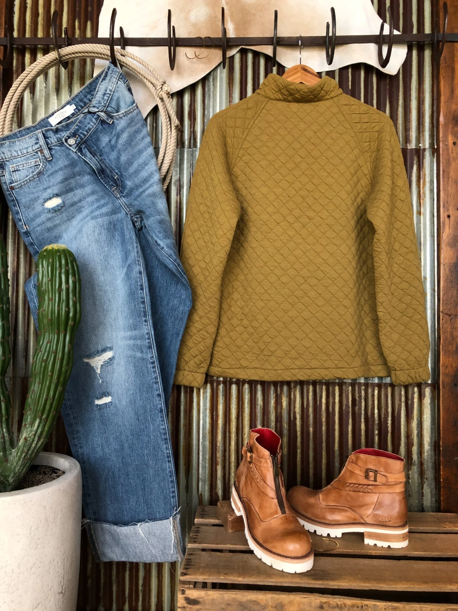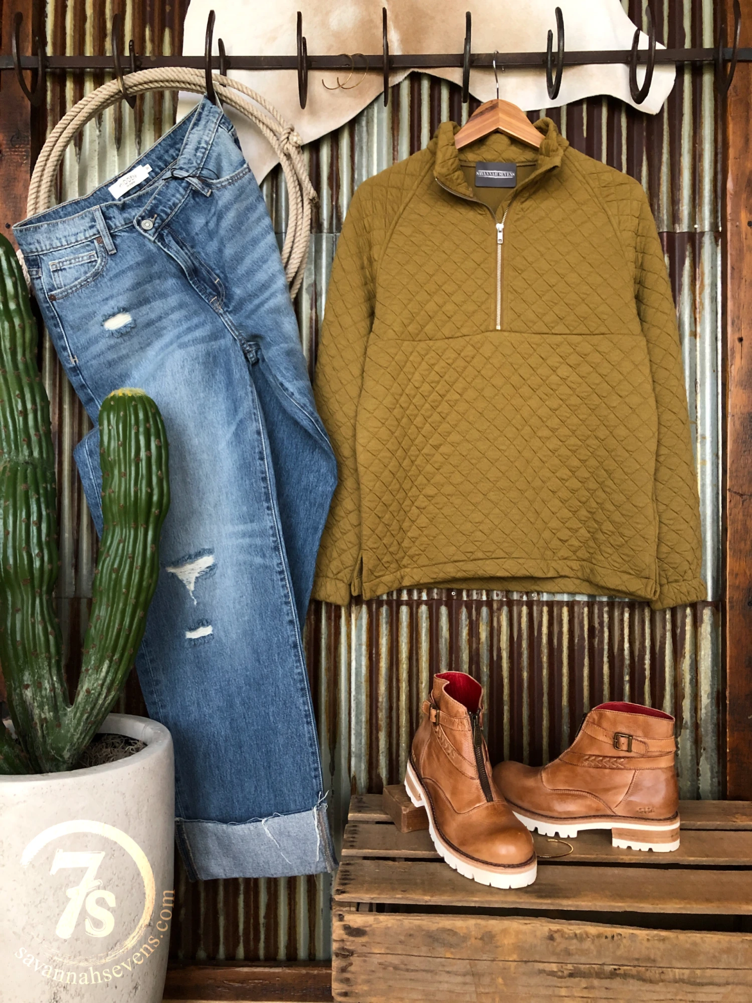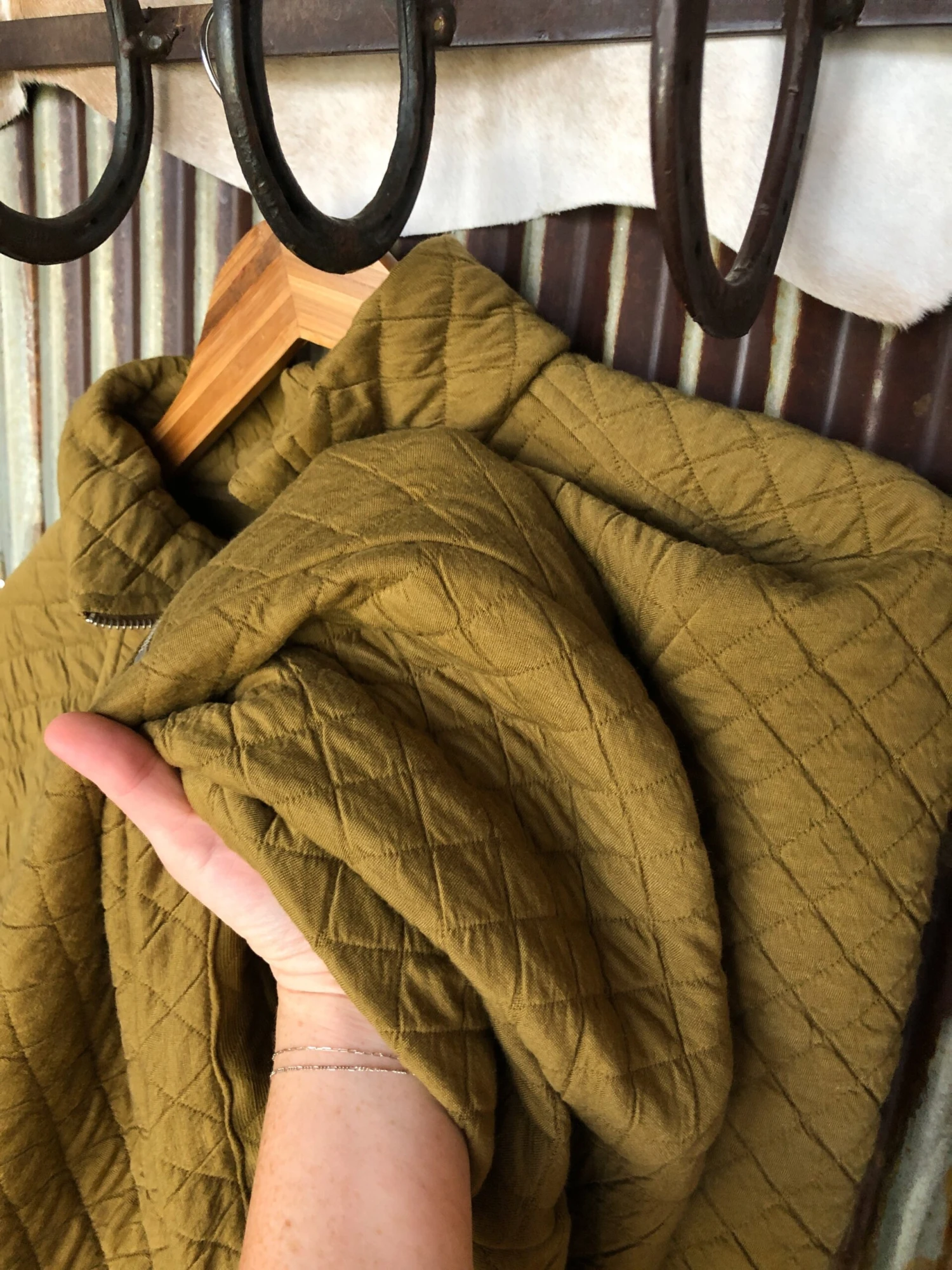 - Chartreuse olive quilted long sleeve quarter zip pullover.