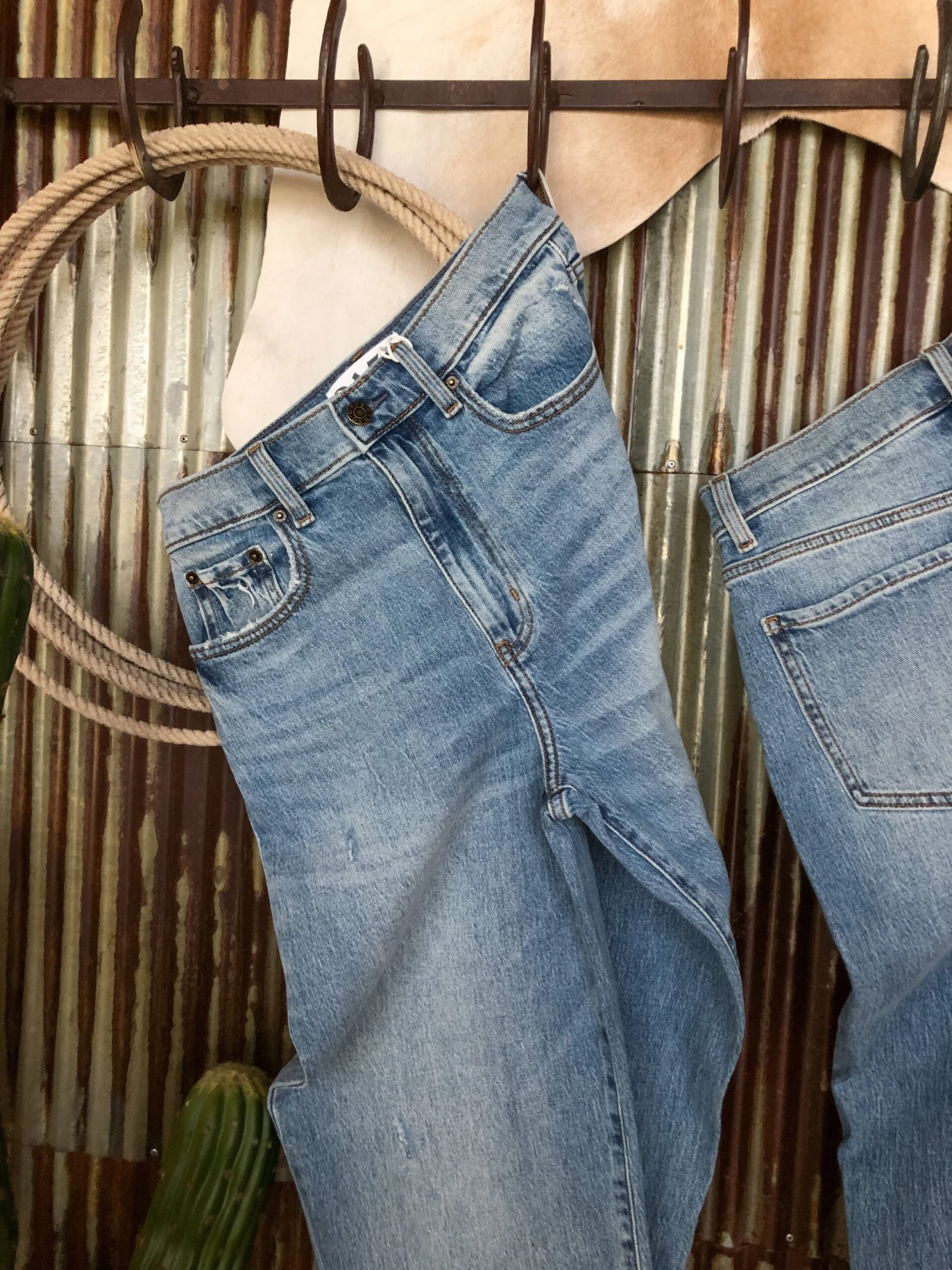 - Subtle distressing on front pockets and hem.