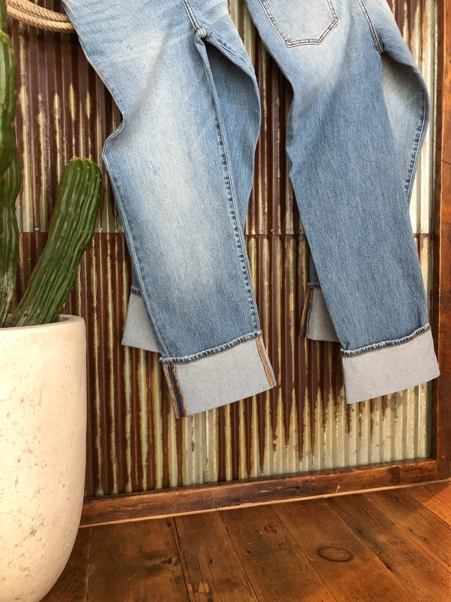 - Straight leg with tacked cuff.