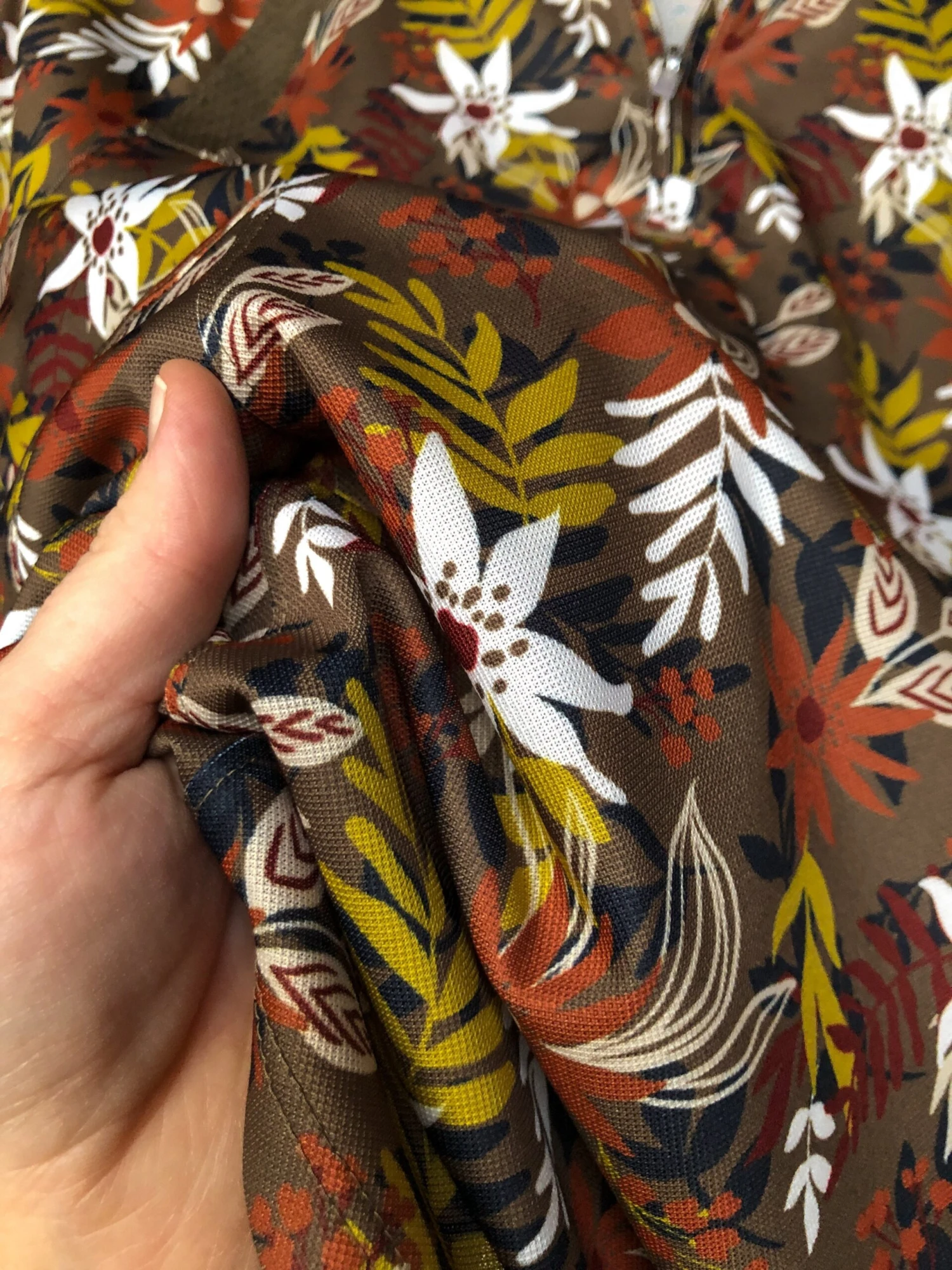 - Olive bark with chartreuse, rust, white, and midnight blue floral print.