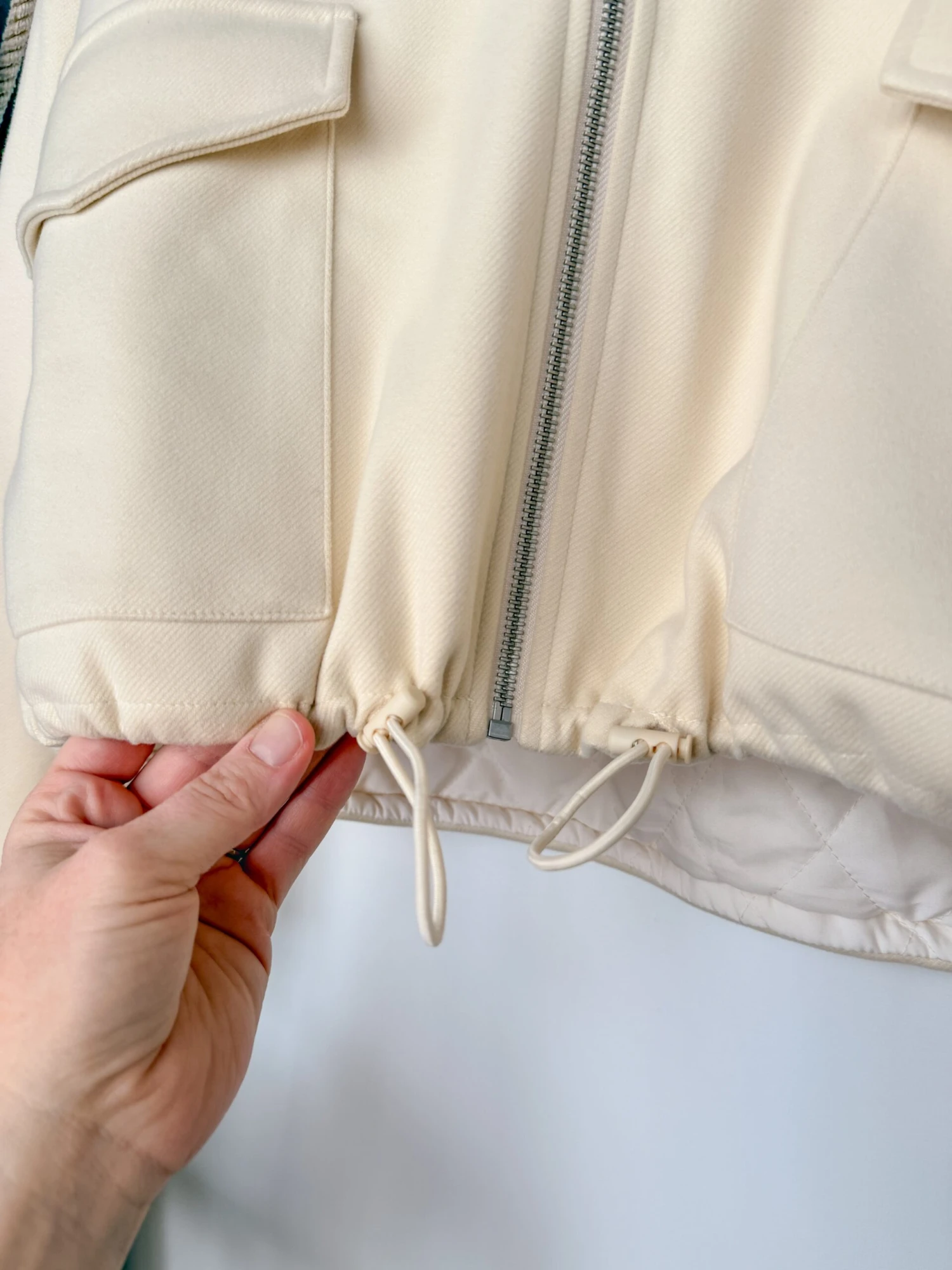 - Adjustable elastic cord drawstring hem.